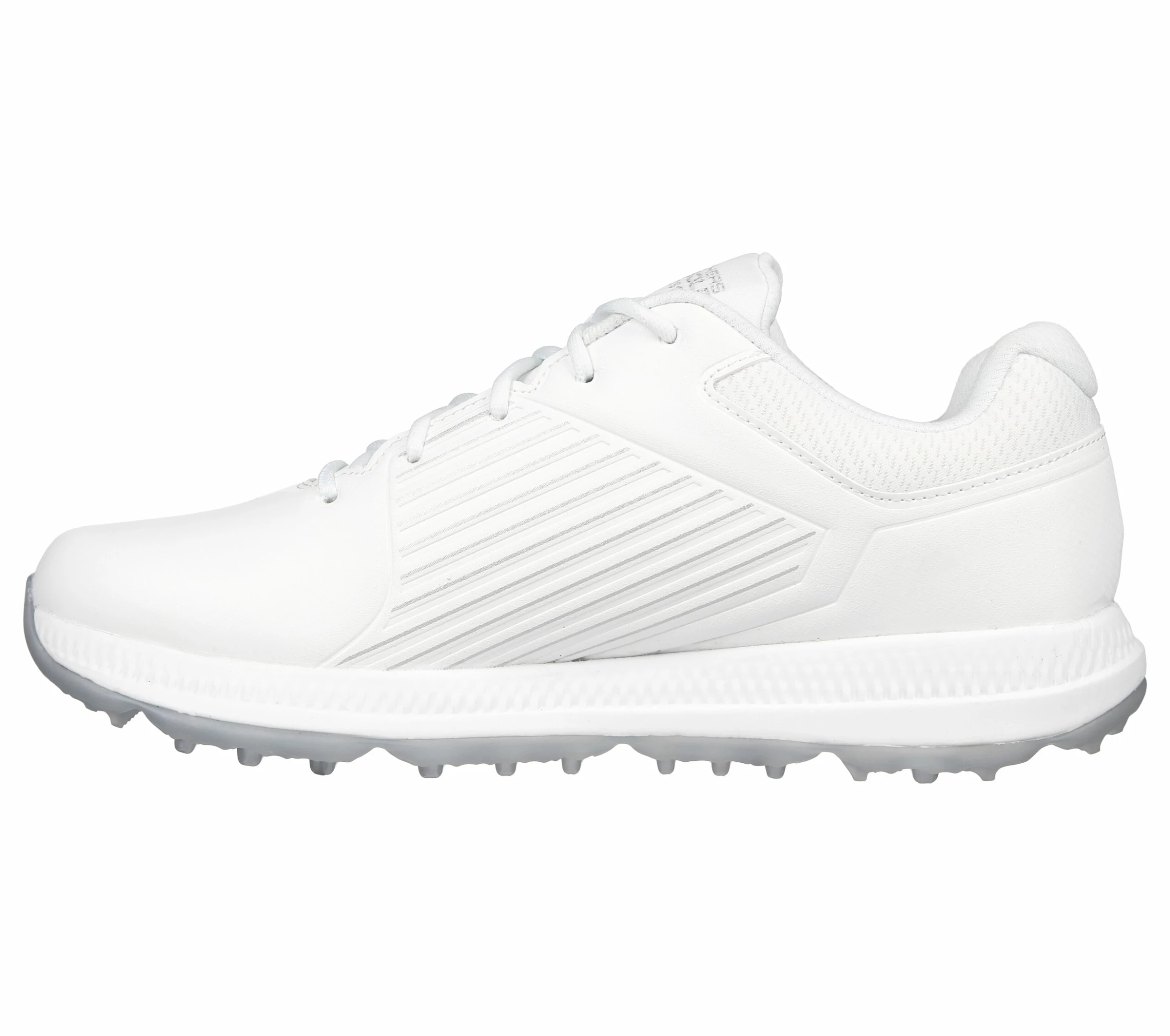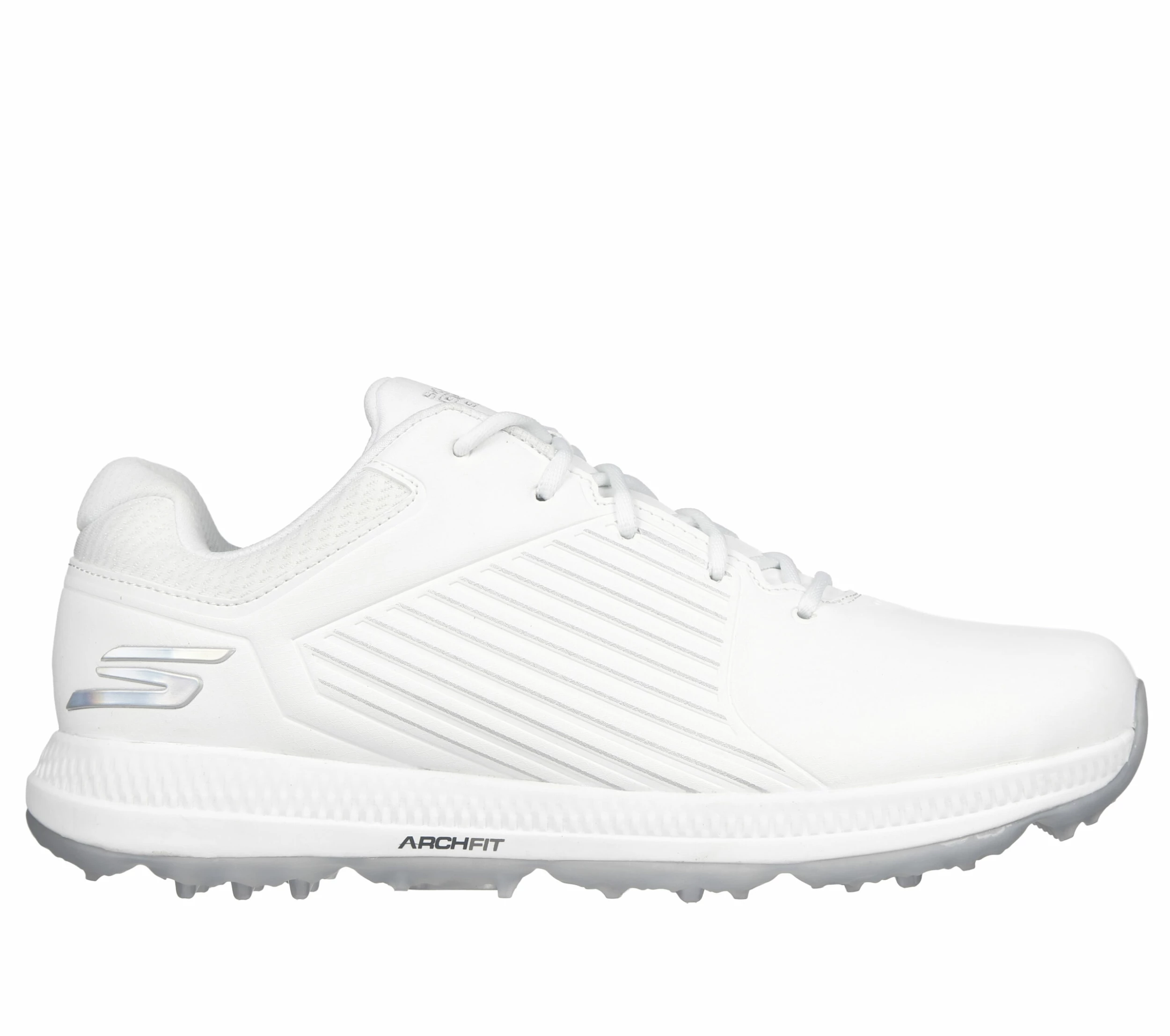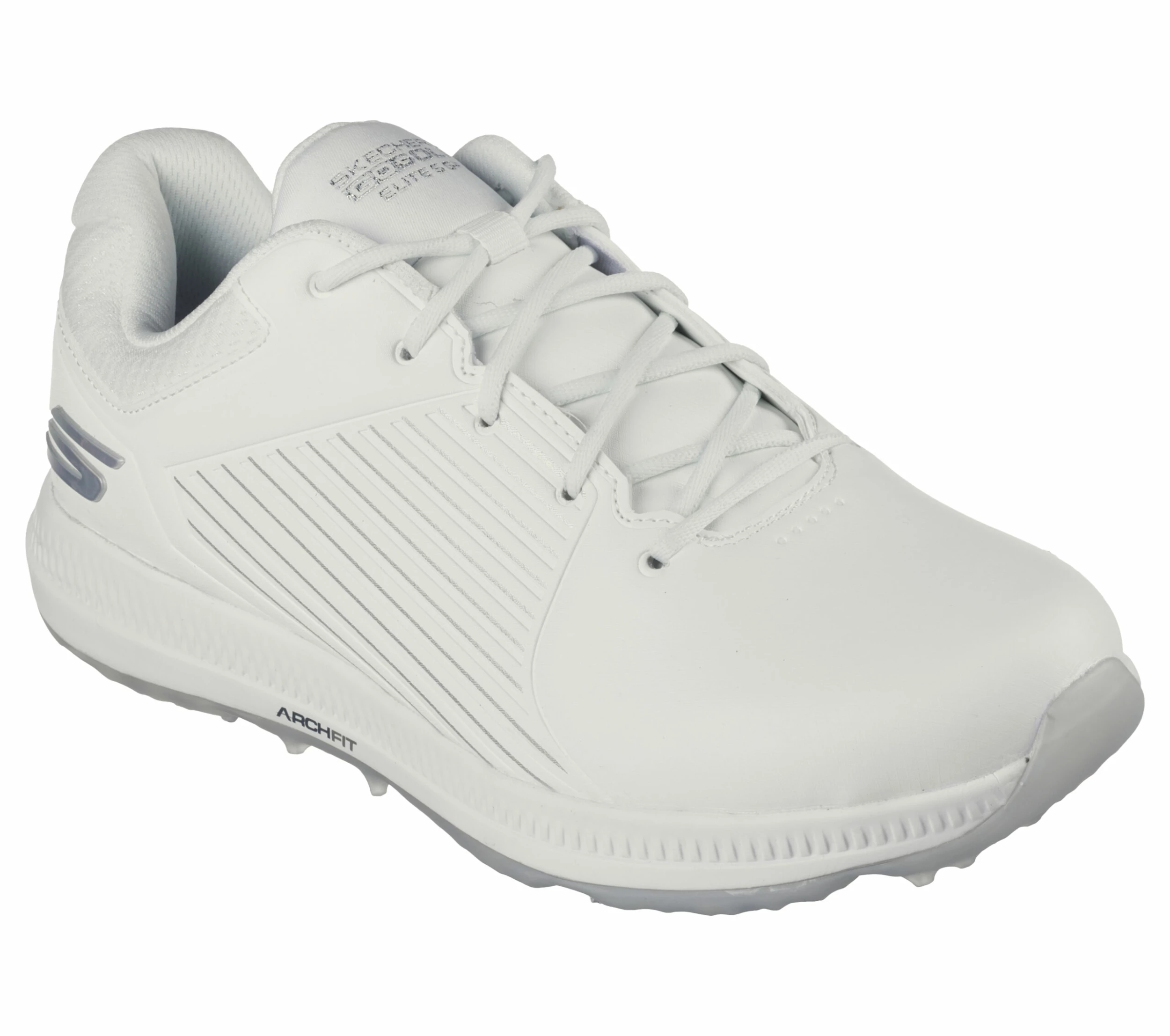 Play your most comfortable round wearing Skechers Arch Fit® GO GOLF® Elite 5 – GF. This lace-up golf design features a waterproof synthetic upper with a removable Arch Fit® comfort insole and a spikeless traction outsole.