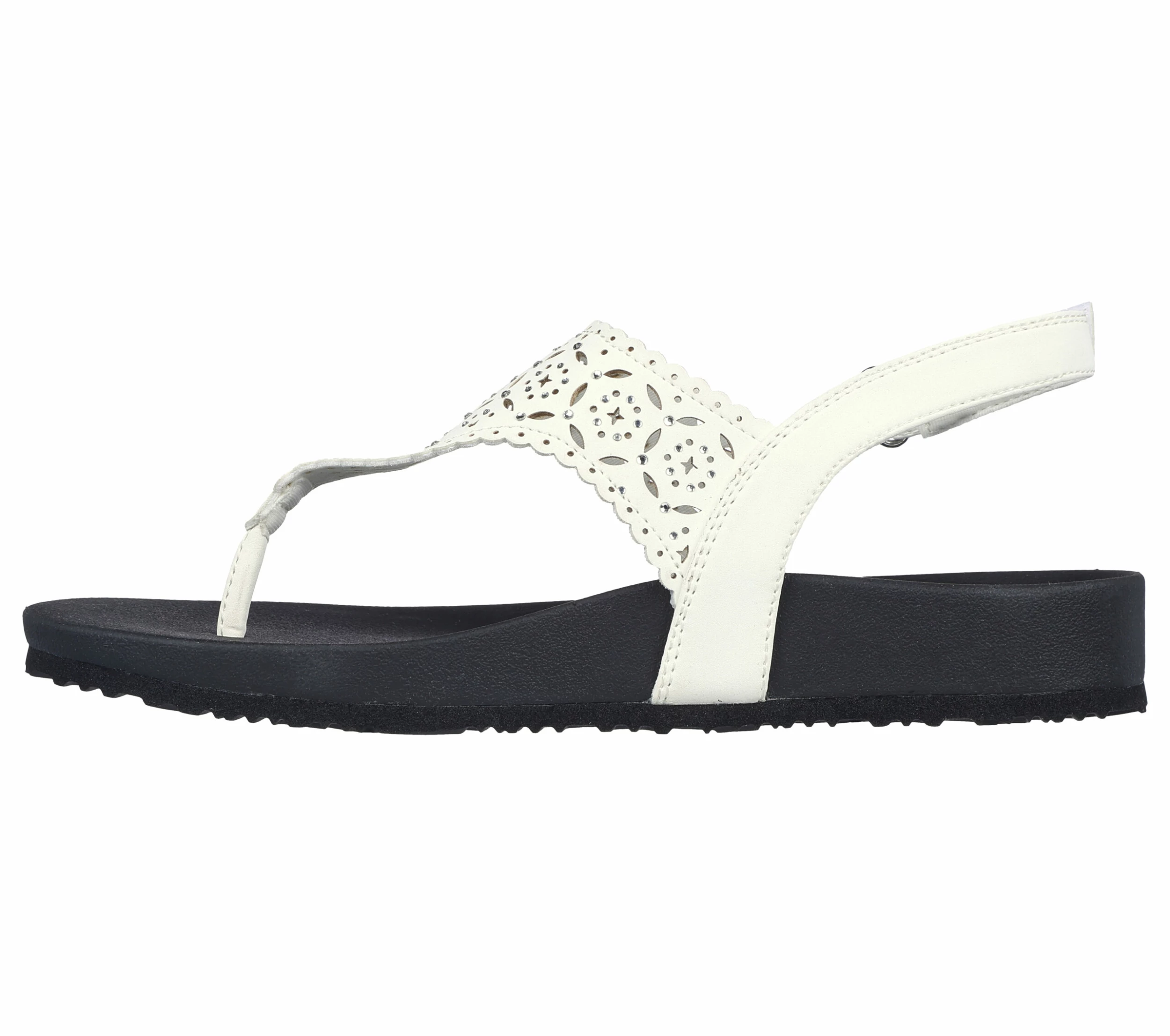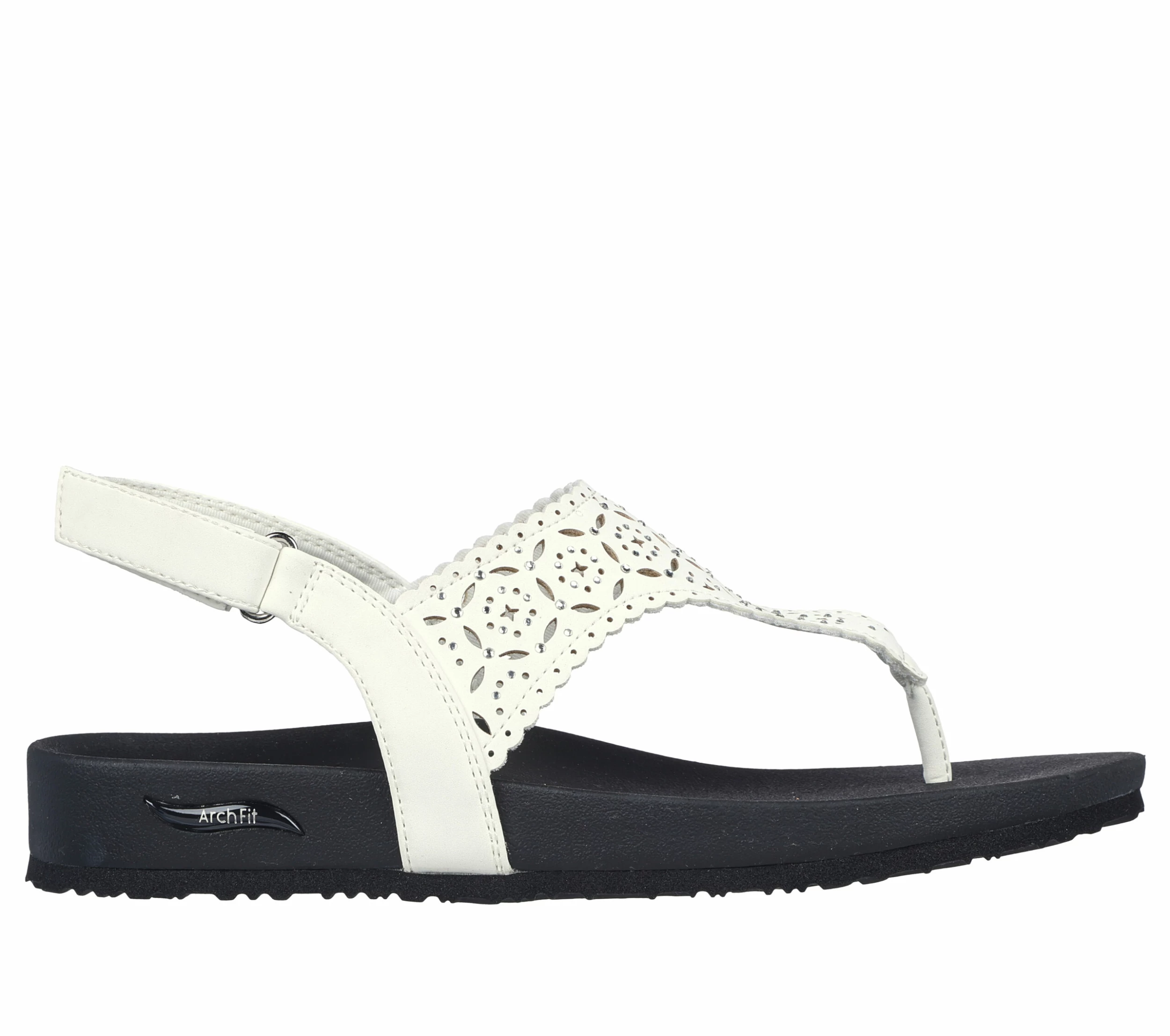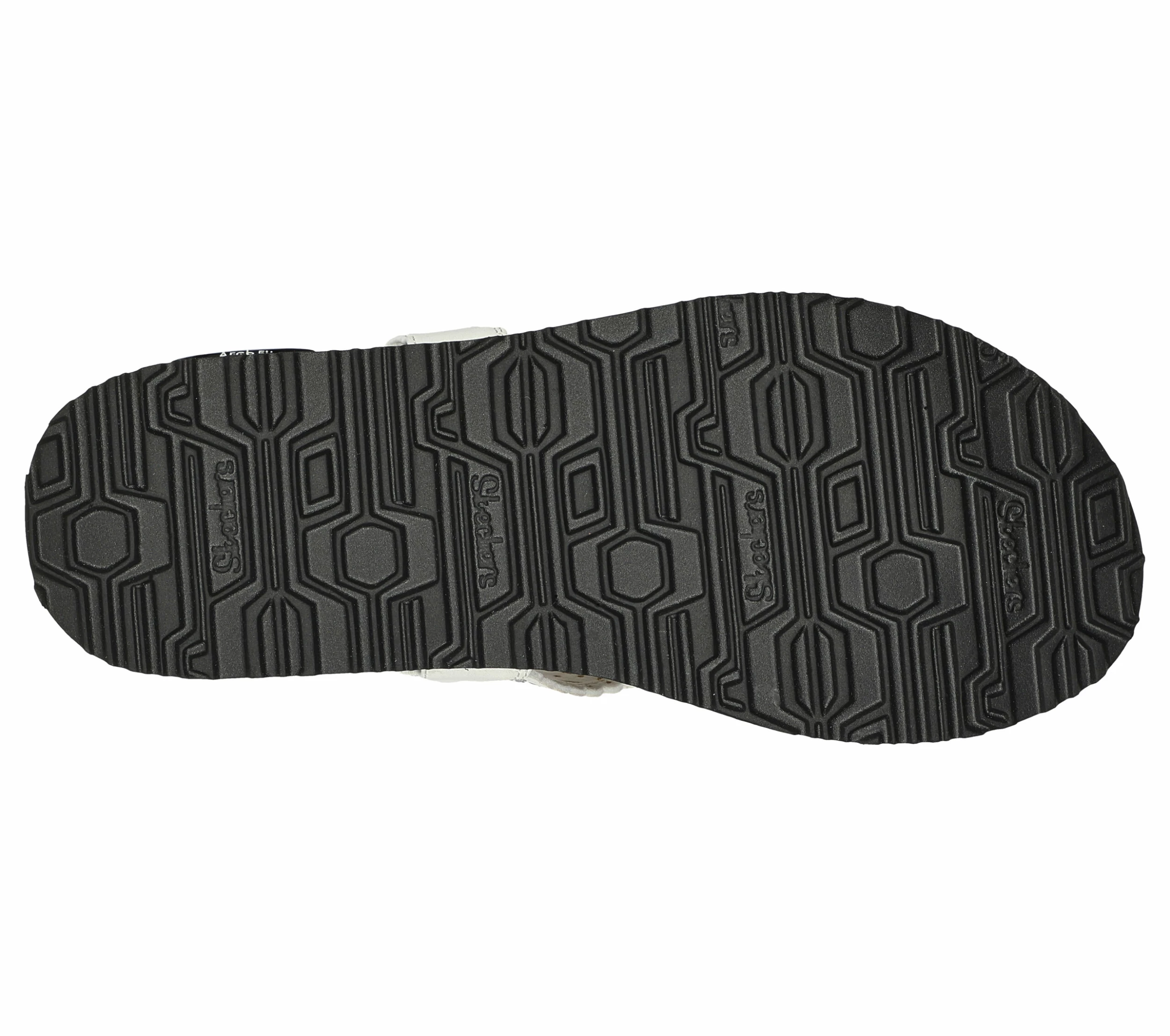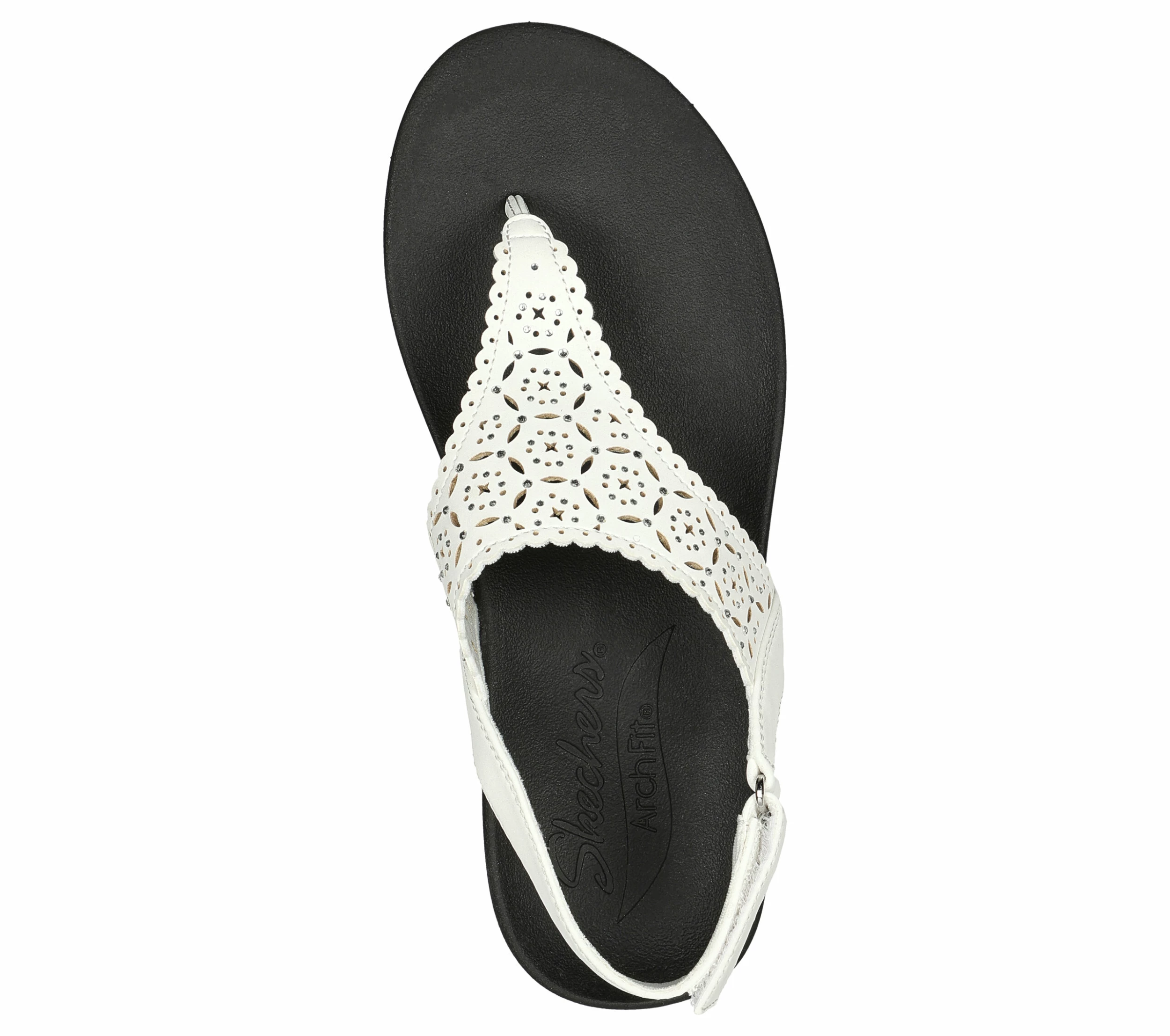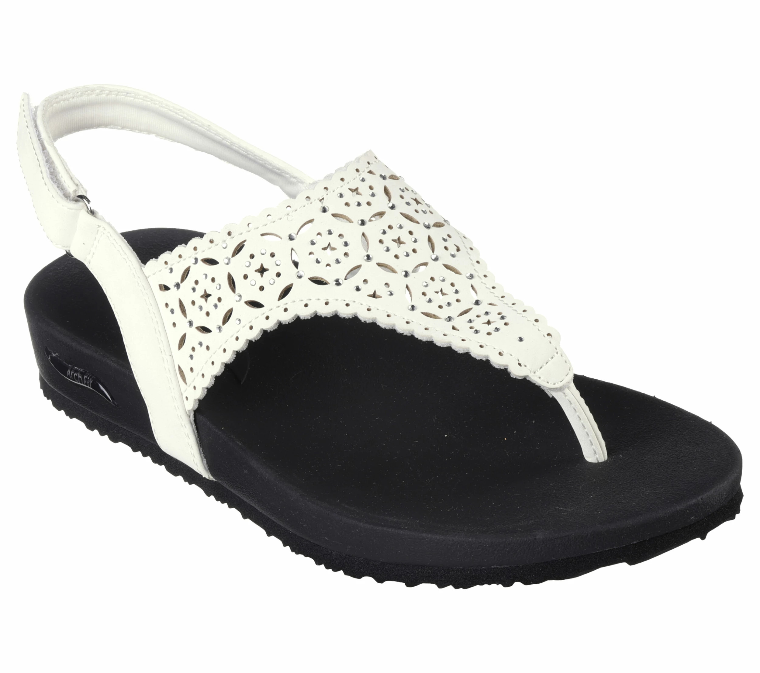 Stay supported in comfort and shimmering style with Skechers Arch Fit® Meditation – Sophie. This hooded thong sandal features a scalloped synthetic upper with cutout details and a supportive Arch Fit® contoured footbed.