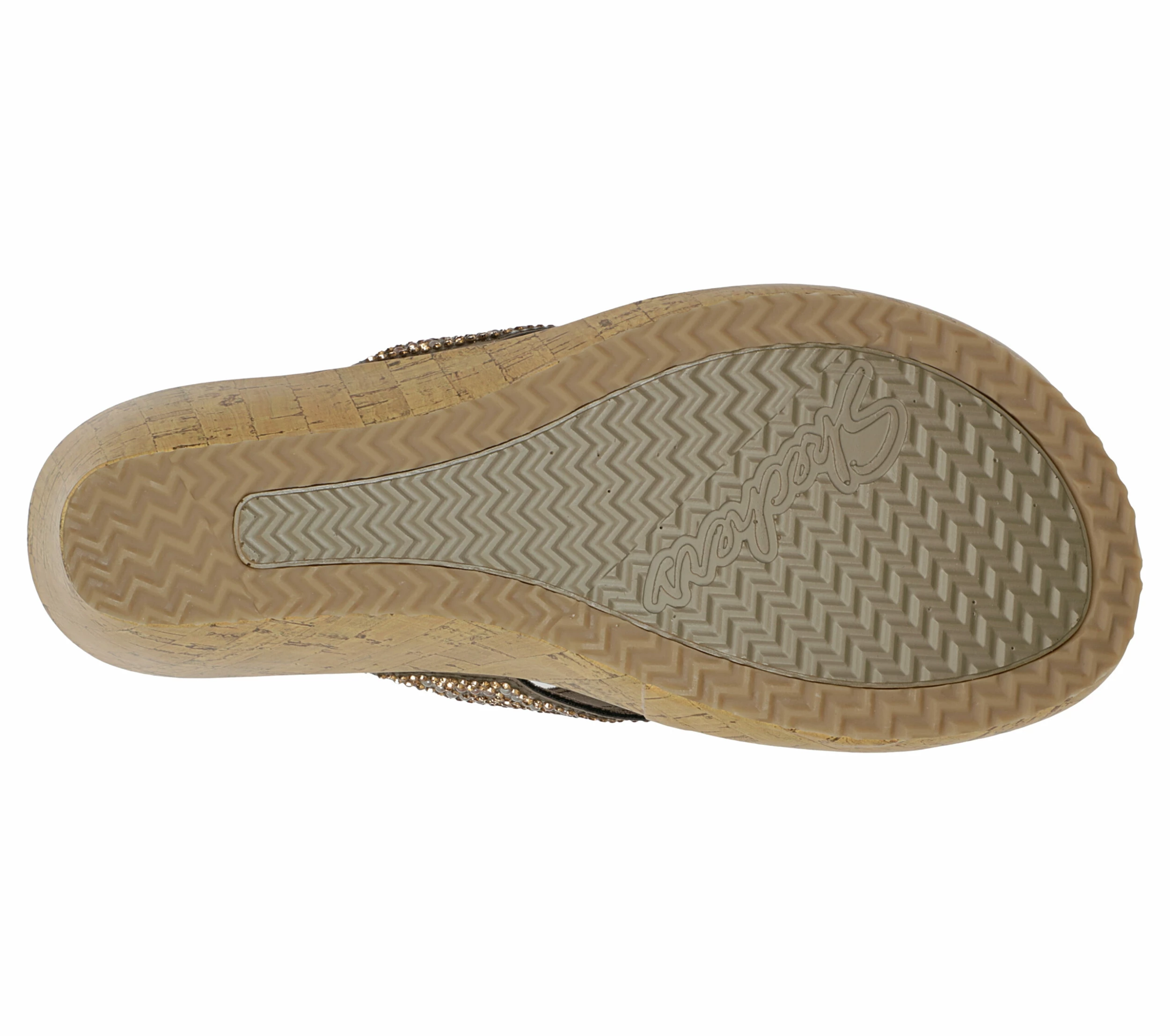 Make a glam statement in stylish comfort wearing Skechers CaliĀ® Beverlee – Charming Pearl. This thong style fashion sandal features a faux-pearl and bead embellished synthetic upper with a cork style wedge midsole and a Luxe FoamĀ® footbed.