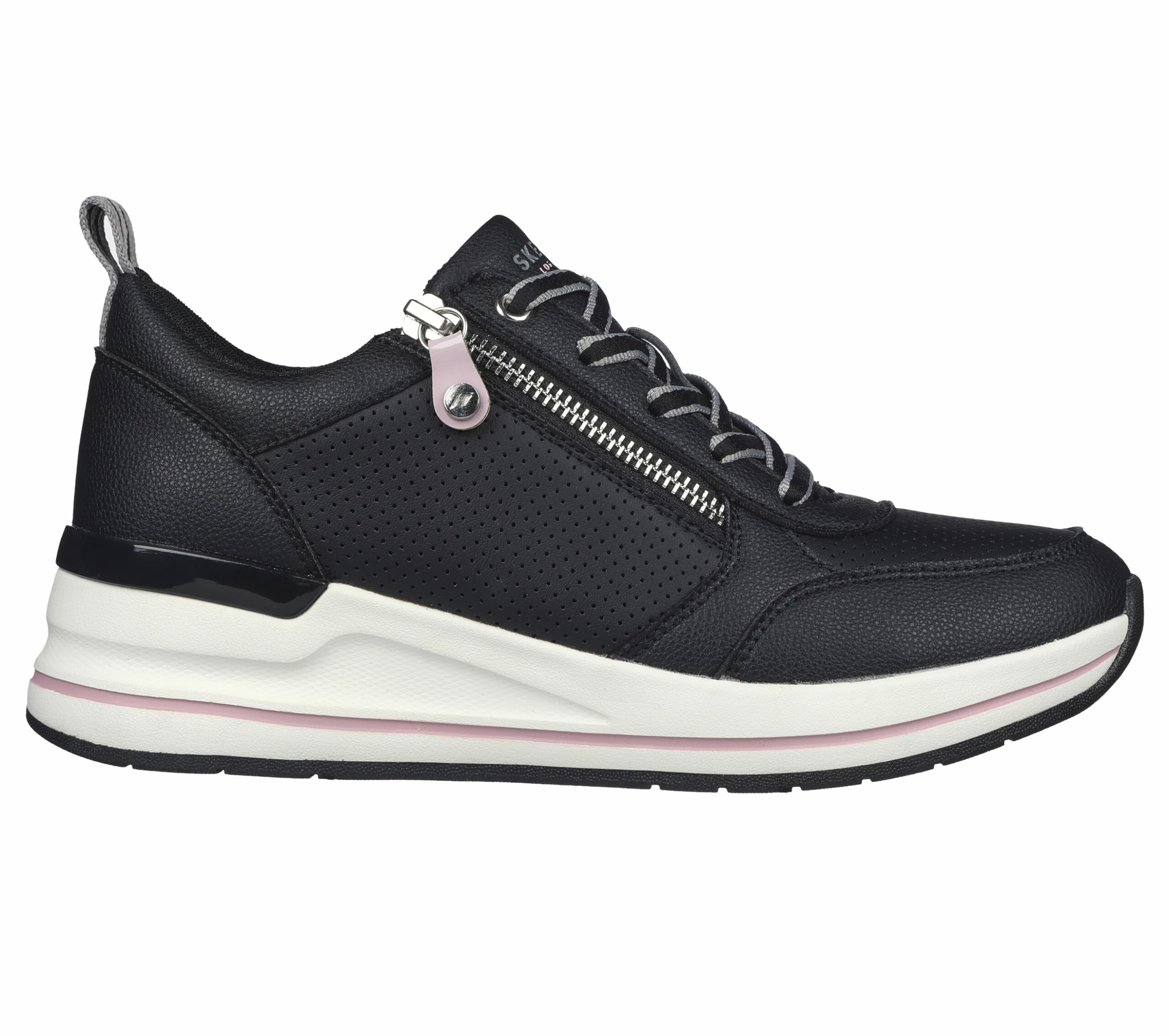 Zip into sporty style wearing Skechers StreetĀ Billion 2 – Side Lines. This fashion lace-up features a perforated duraleather upper with a lateral zipper, a wedge-fit midsole and a Skechers Air-Cooled Memory FoamĀ® insole.