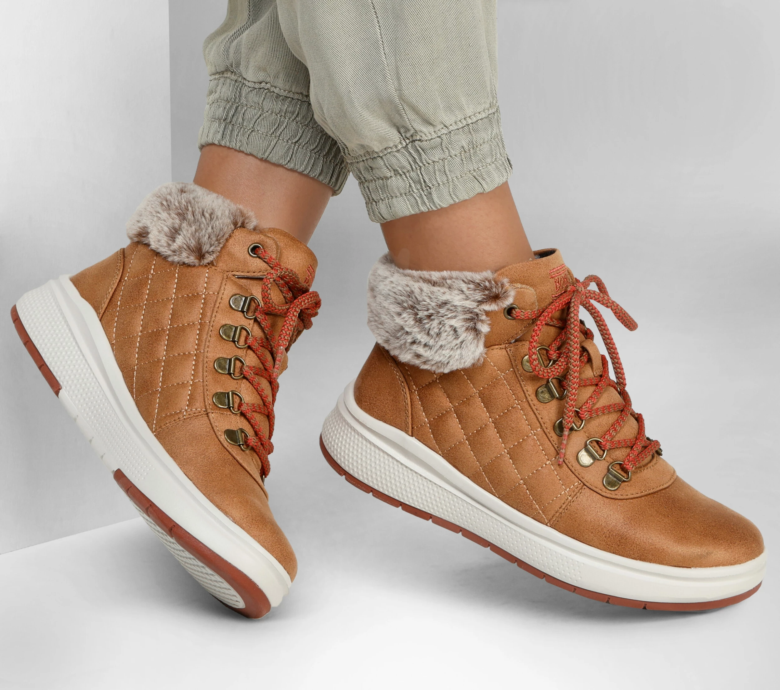 Chic style and plush comfort combine in BOBS from Skechers™ Skipper Wave – Grand Leap. This casual lace-up bootie features a synthetic leather fabric upper with a faux-fur collar and Skechers Memory Foam™ insole. For every BOBS purchase, a donation is made to animals in need.