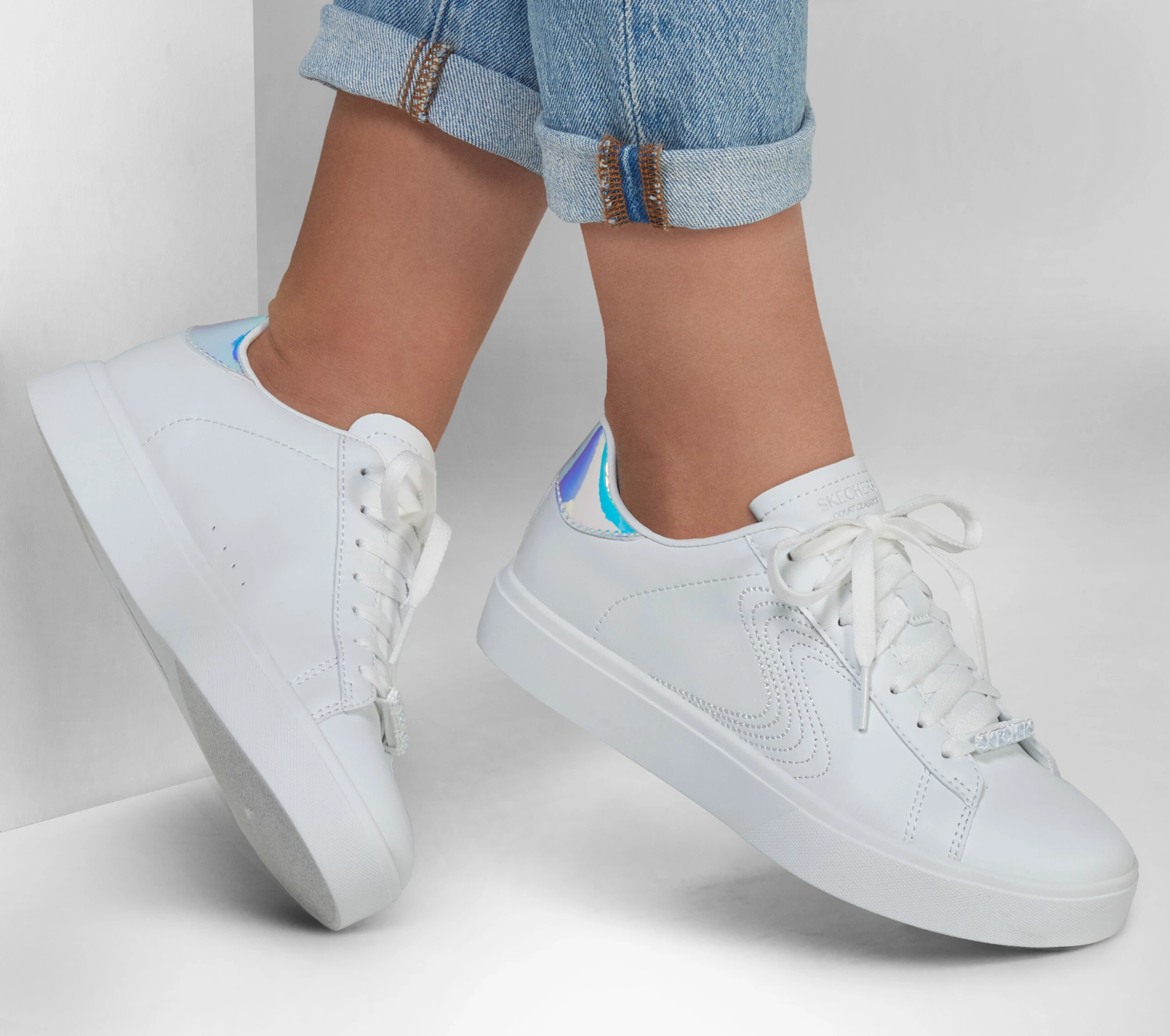 A modern classic style combines with comfort and subtle flair in Skechers Eden LX – Magical Dream. This lace-up design features a synthetic duraleather upper with iridescent lace accessory and heel trim, embroidered quarter detailing, plus a cushioned Skechers Air-Cooled Memory Foam® insole