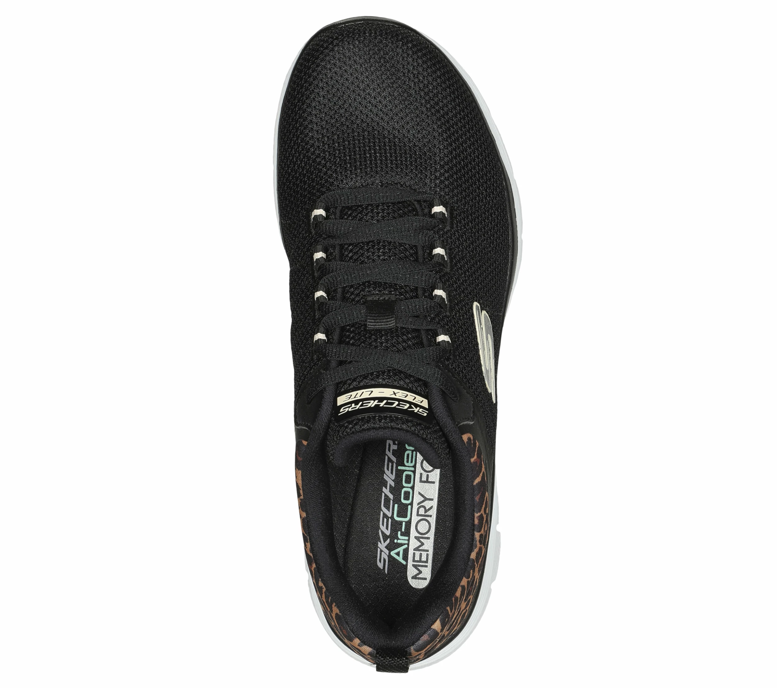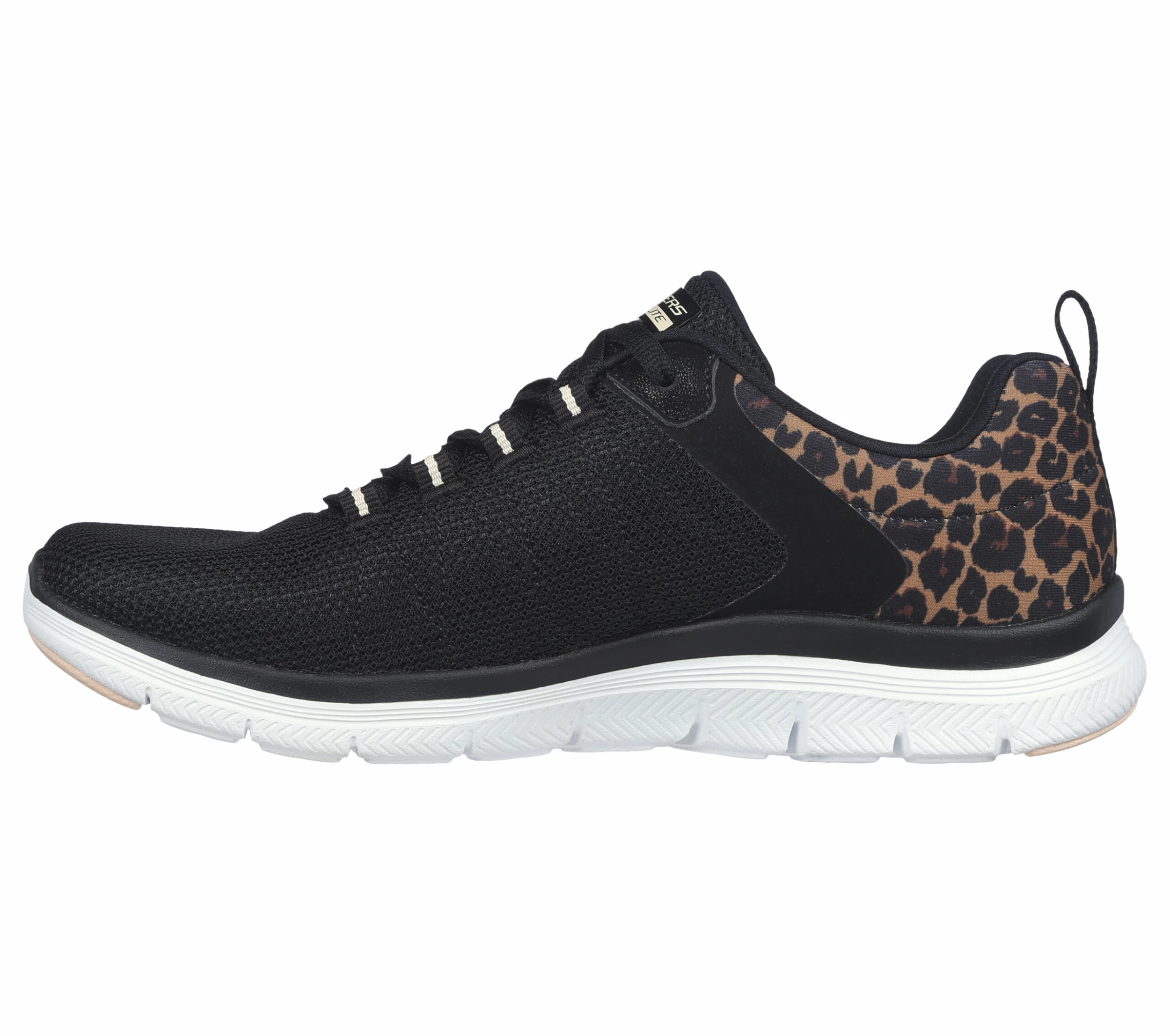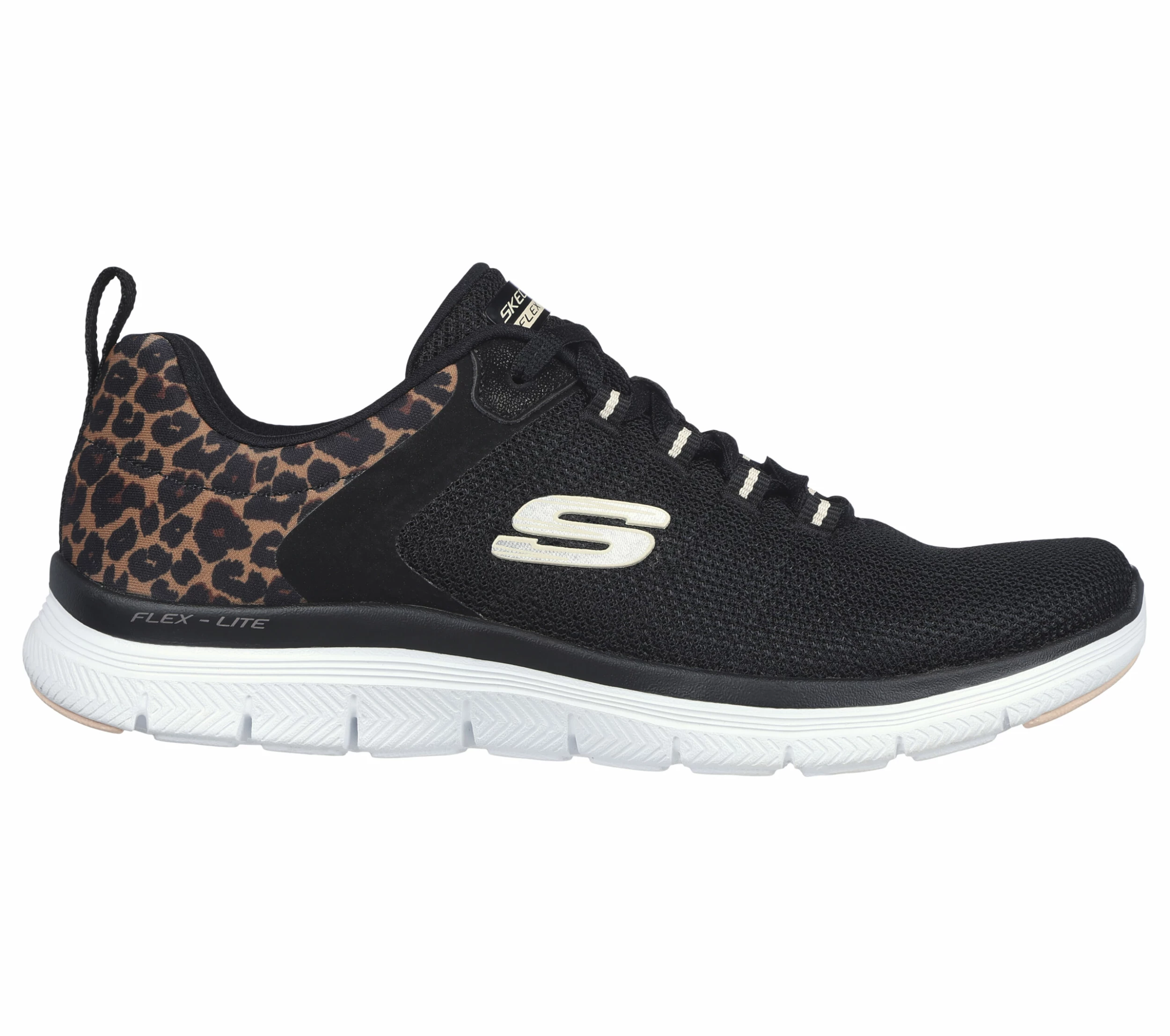 100% KNITTED COMFORTĀ® Break out of the house and into purr-fect comfort with Skechers Flex AppealĀ® 4.0 – Wild Ballad. This sporty vegan lace-up features a mesh upper with leopard print heel trim and a cushioned Skechers Air-Cooled Memory FoamĀ® insole.
