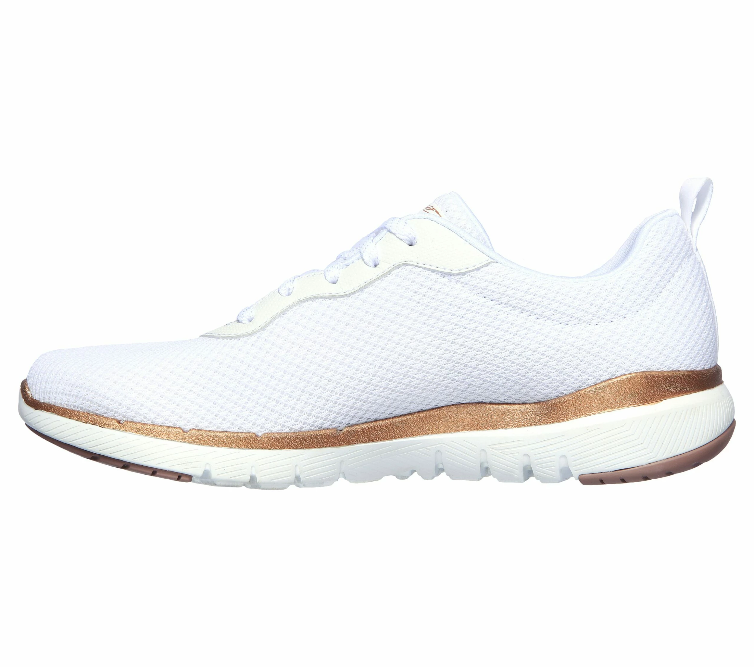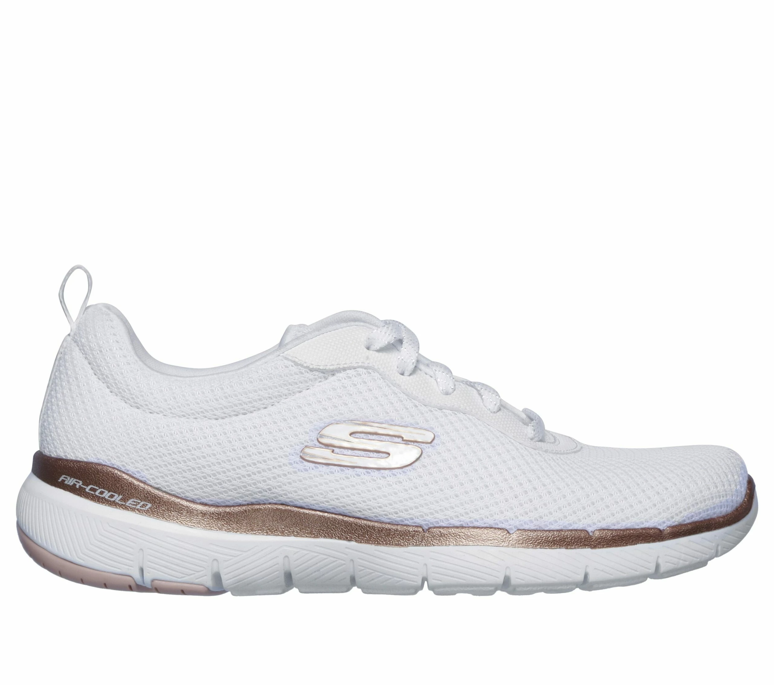 Take the lead in athletic stylish comfort with the Skechers Flex Appeal 3.0 – First Insight shoe. shoe. This lace-up sneaker features a soft flat mesh knit upper with a synthetic trim and cushioned Air-Cooled Memory FoamĀ® insole.
