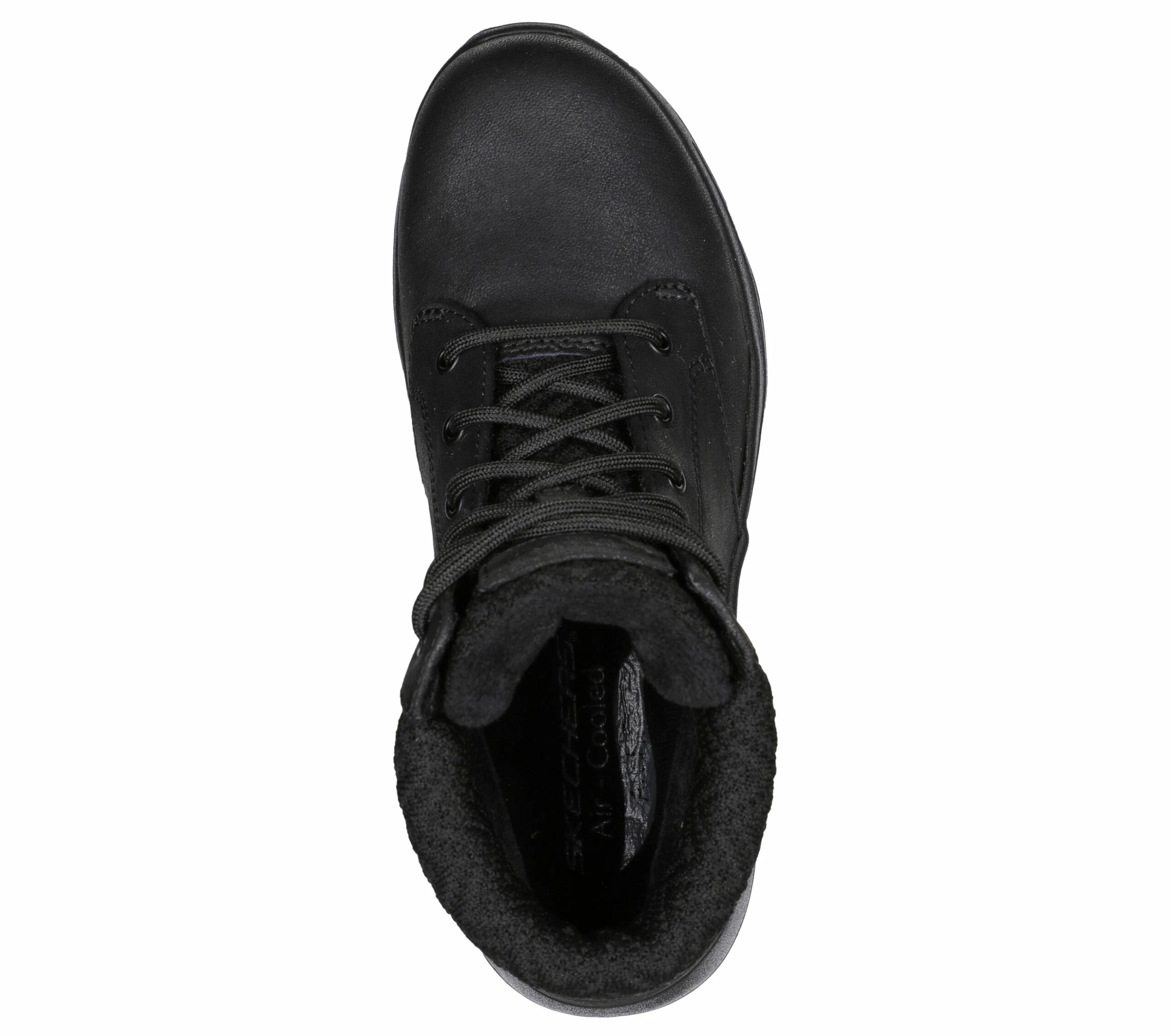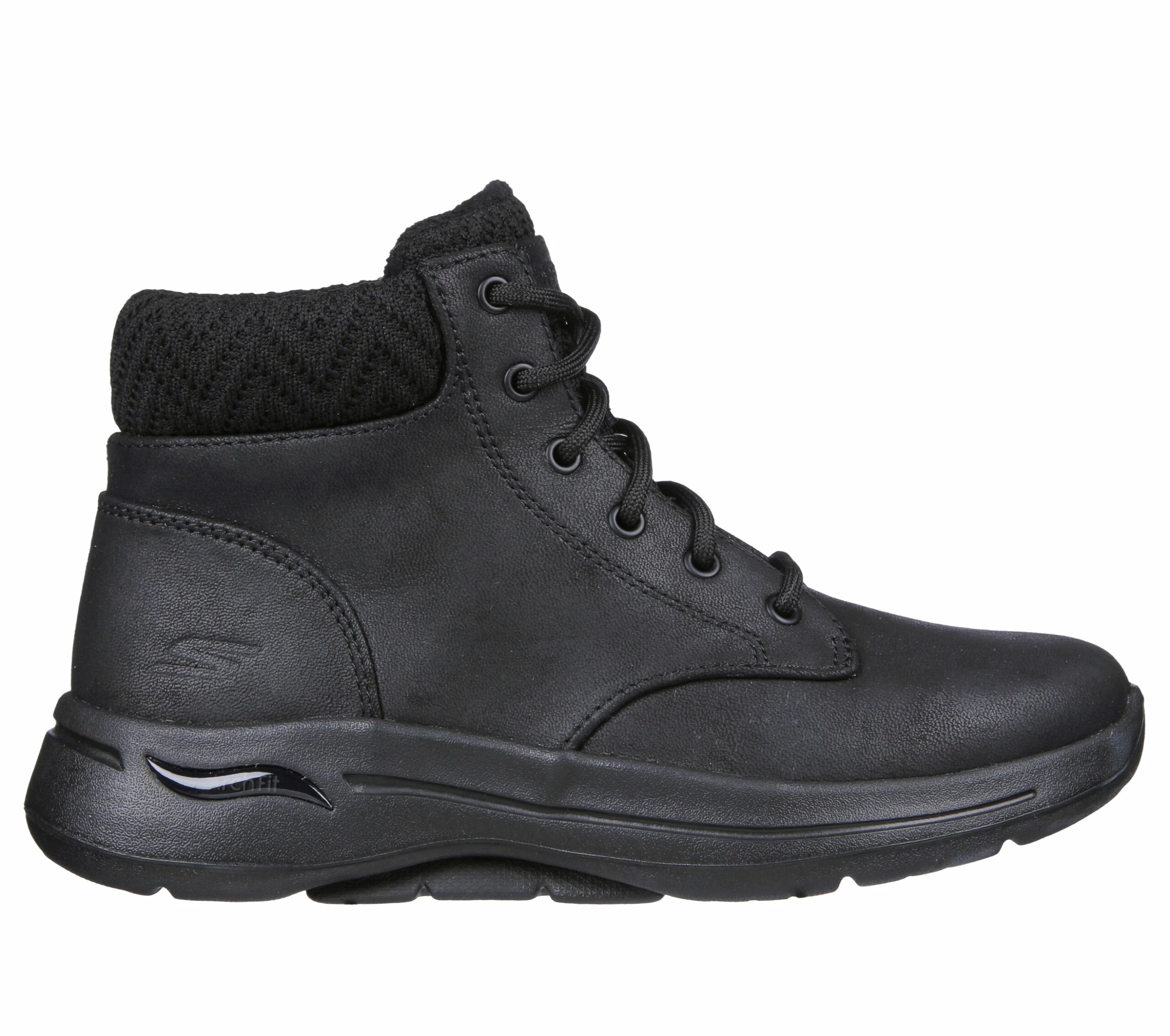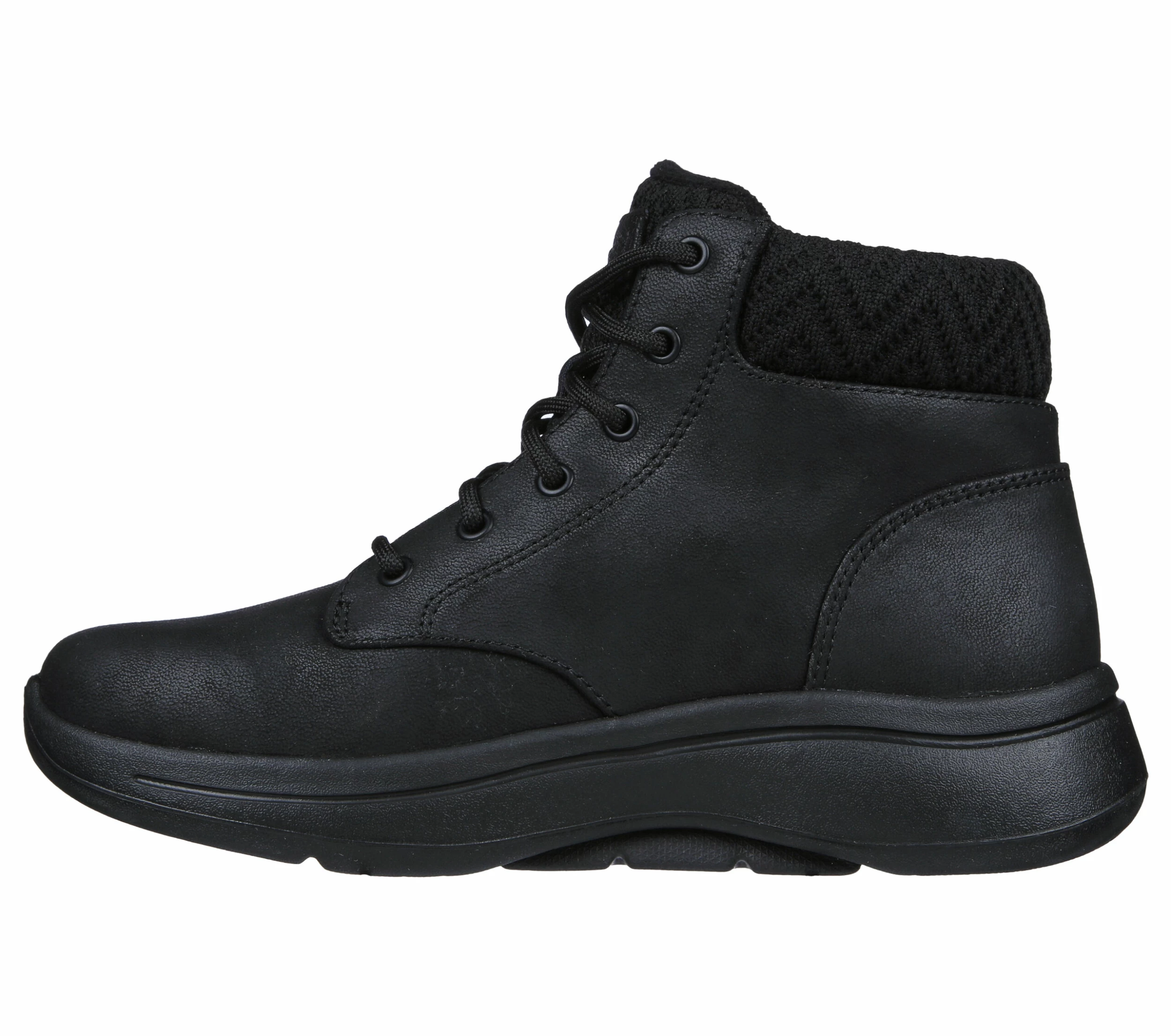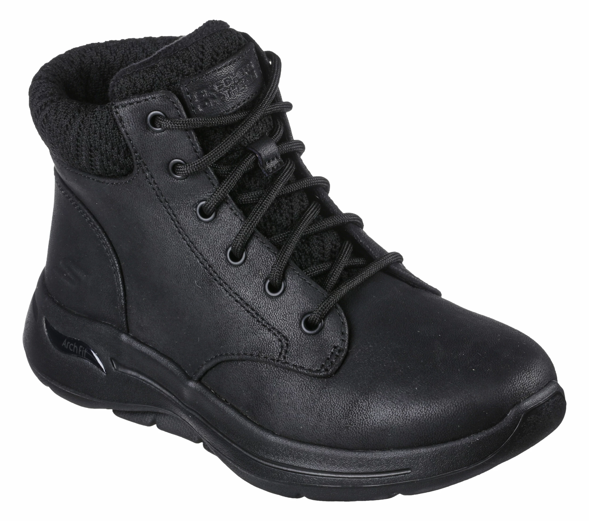 Lace into cold weather classic style and incredible comfort wearing Skechers GO WALK Arch Fit® Boot – Simply Cheery. This chenille lined lace-up bootie features a 3M® Scotchgard® treated synthetic leather upper with sweater detail at the collar and tongue, a removable Arch Fit® insole, a lightweight ULTRA GO® cushioned midsole, and high-rebound Comfort Pillar® technology.