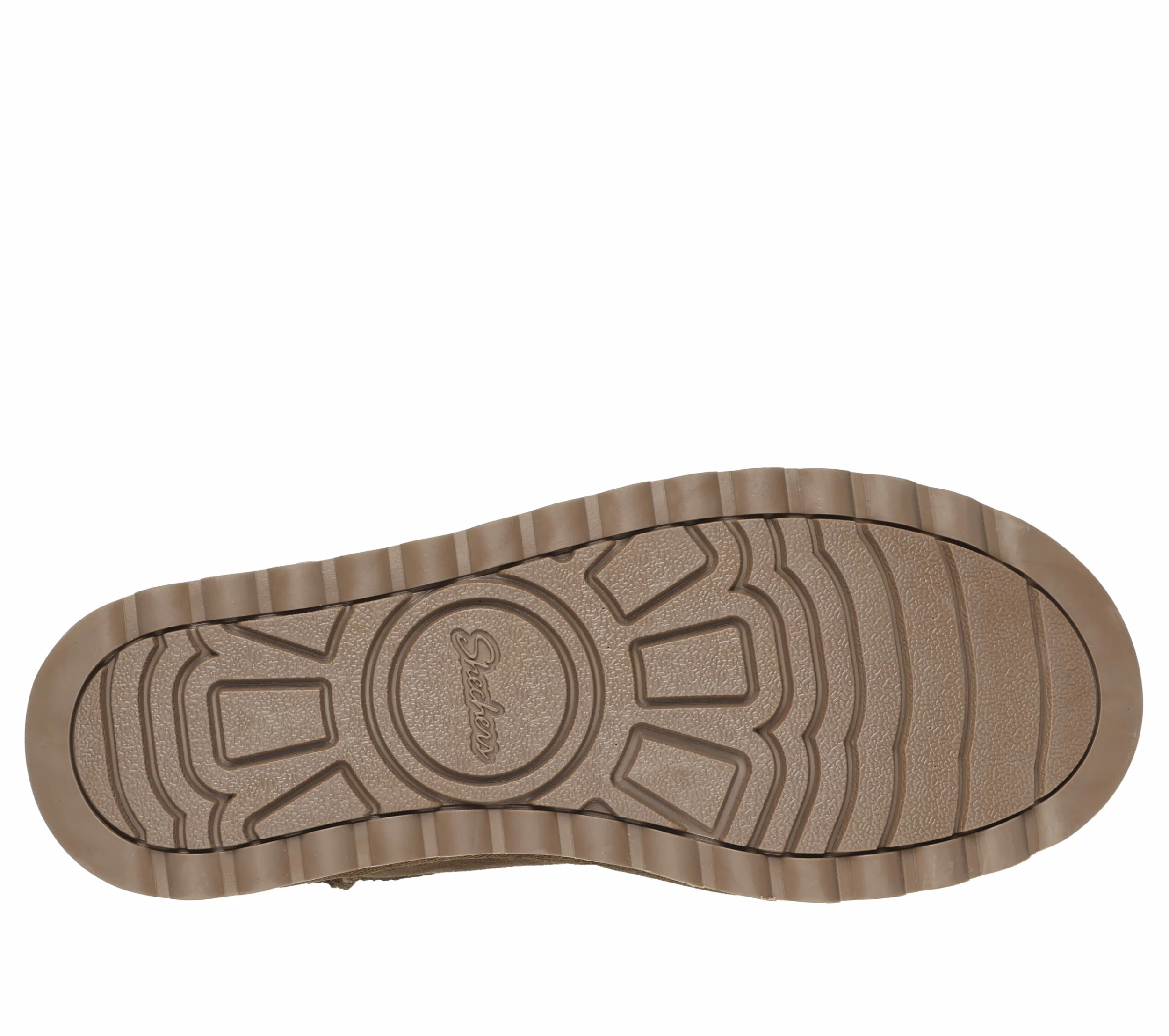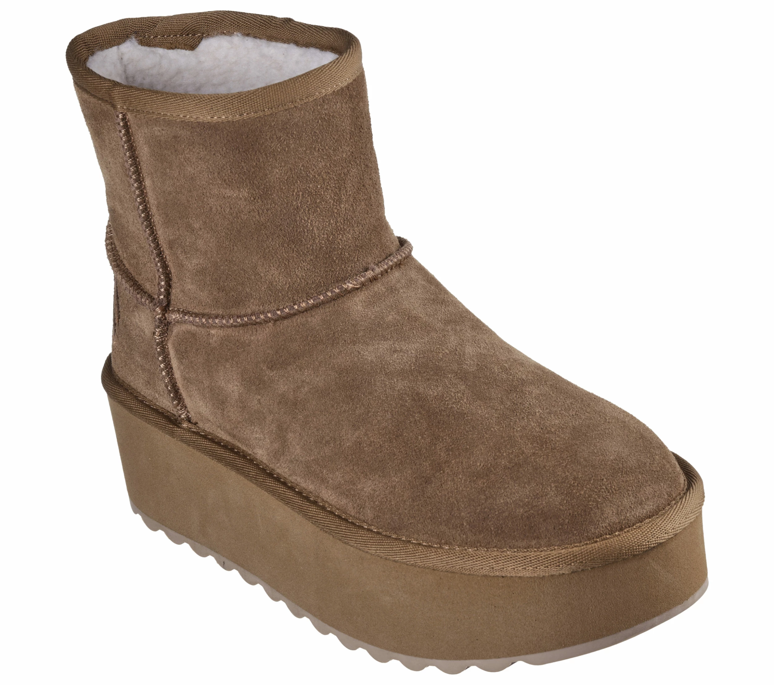 Raise the temps with new heights of style wearing Skechers Keepsakes Stacked. This platform cold-weather pull-on boot features a 3M® Scotchgard® treated suede leather upper with faux shearling lining and a cushioned Warm Tech Memory Foam insole.