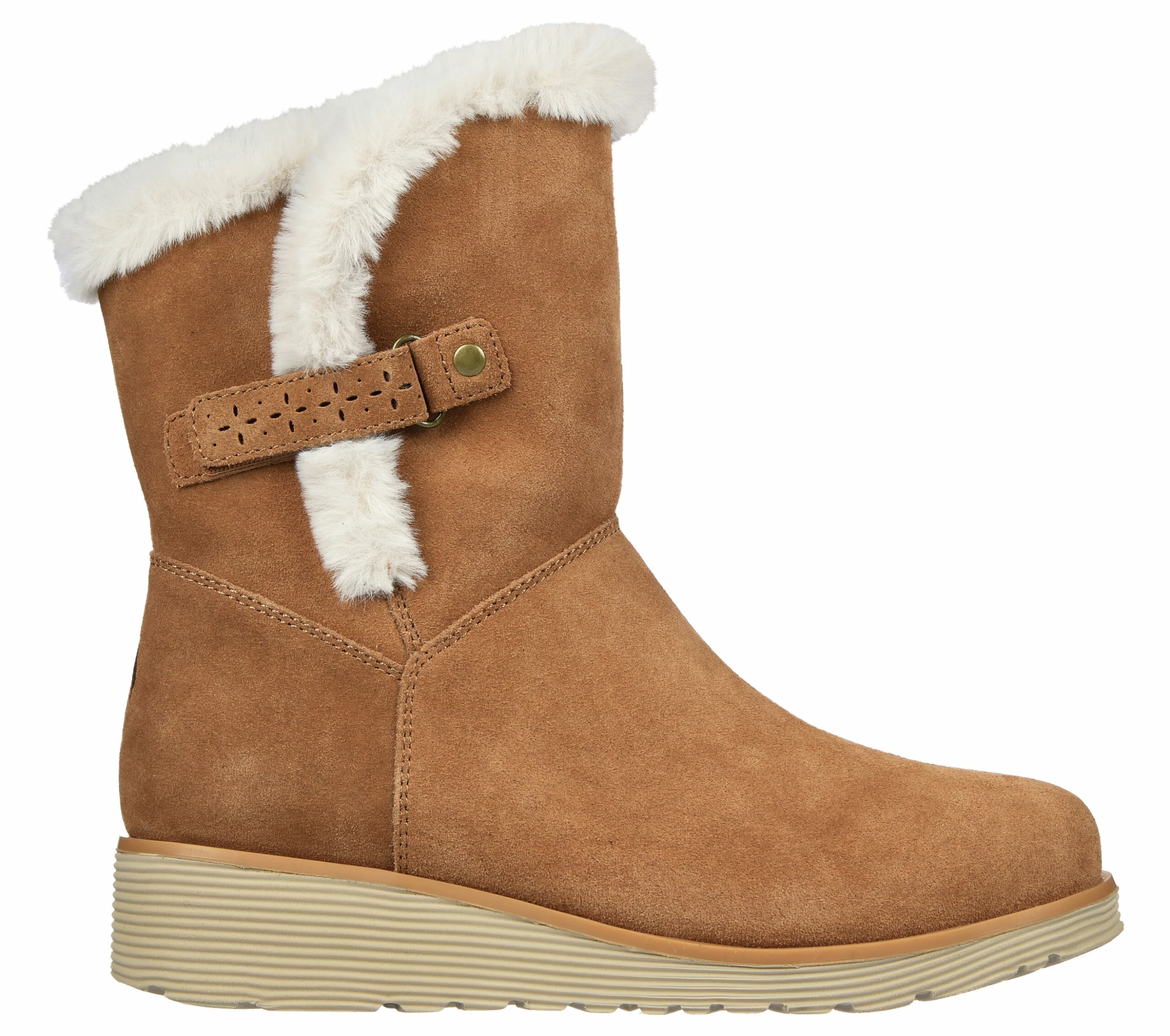 Step into cozy comfort this season in Skechers Keepsakes Wedge – Major Moments. This casual cold-weather boot features a soft suede upper with a faux-fur trim, pull-on style and a cushioned Warm Tech Memory Foam insole.