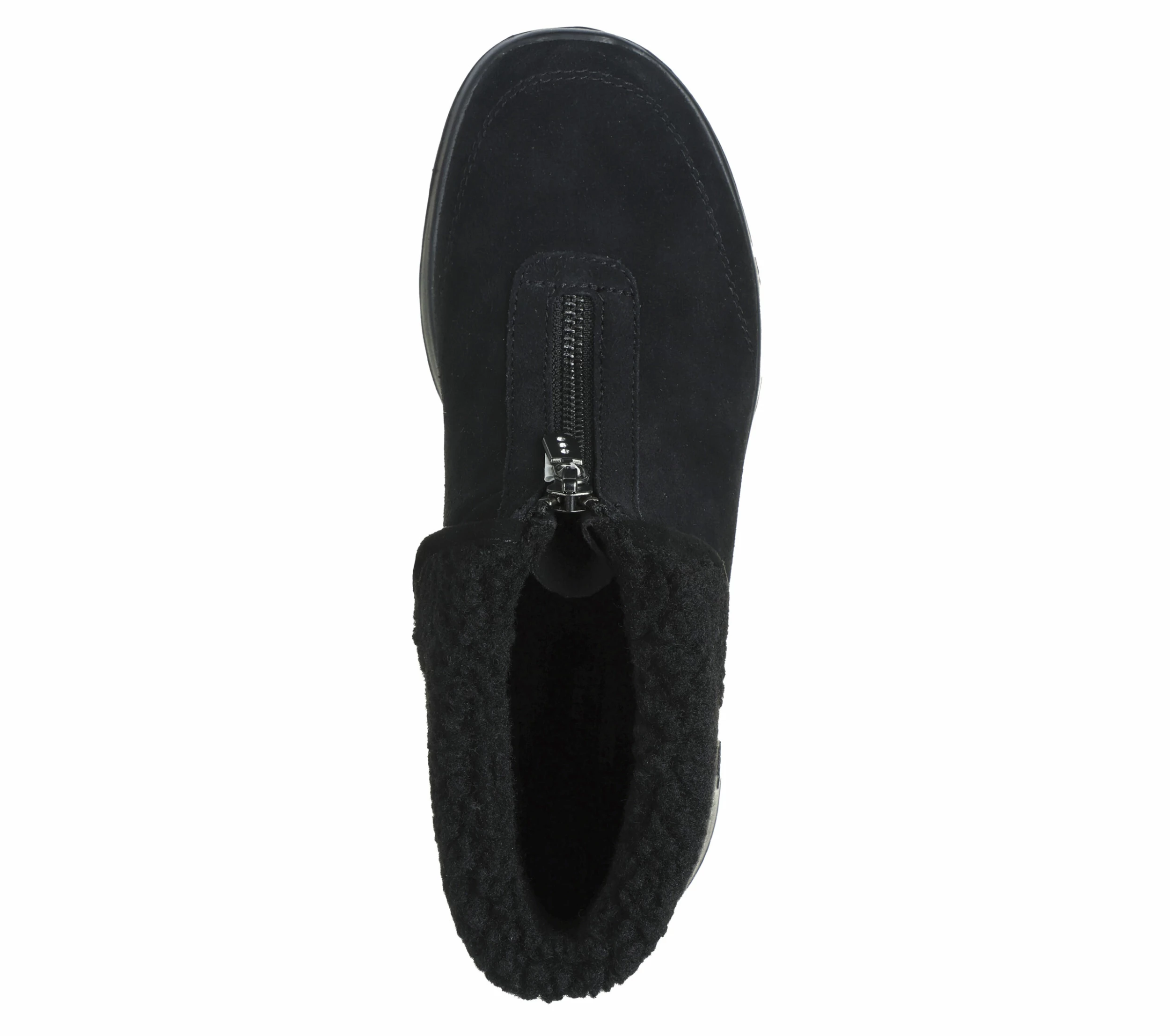 - Suede upper with a front zip closure