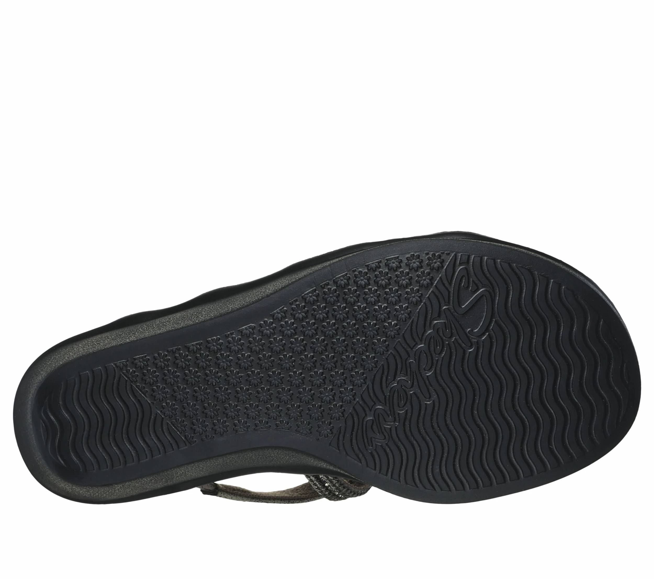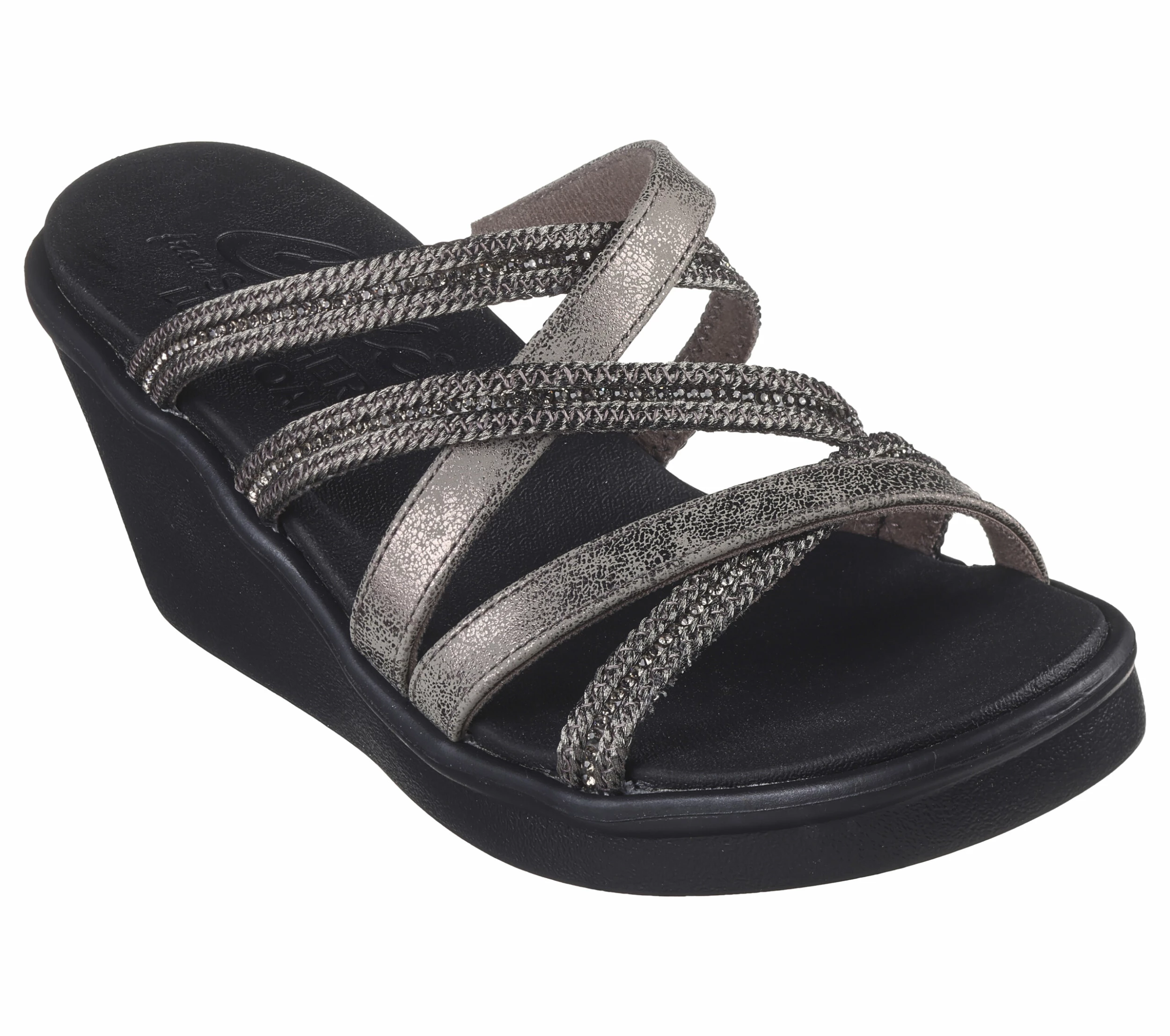 Sunny-weather glitz combines with easygoing comfort in Skechers CaliĀ® Rumble On – Classy Way. This classic wedge sandal features a synthetic knit upper with woven metallic detail, and a cushioned Luxe FoamĀ® footbed.