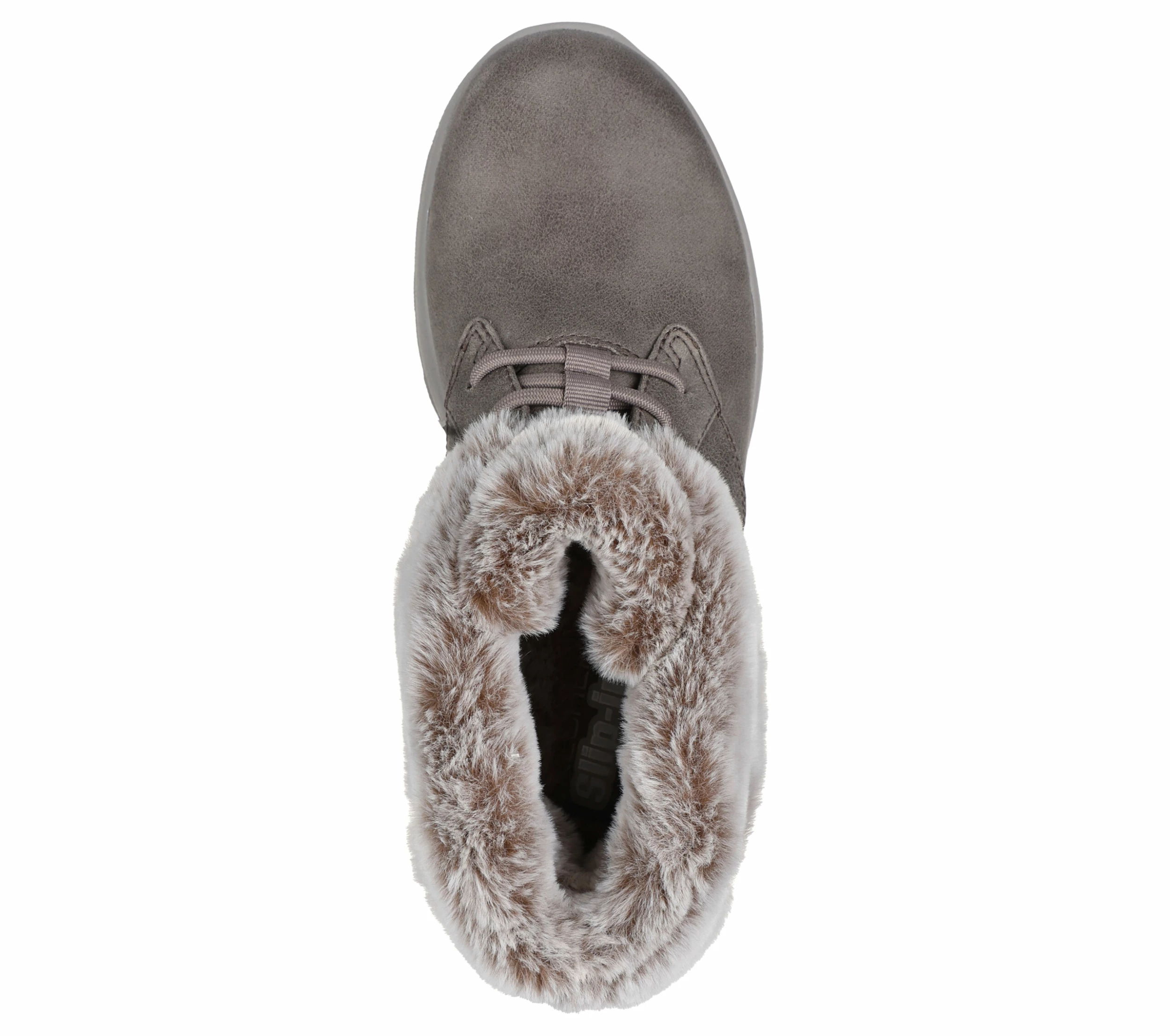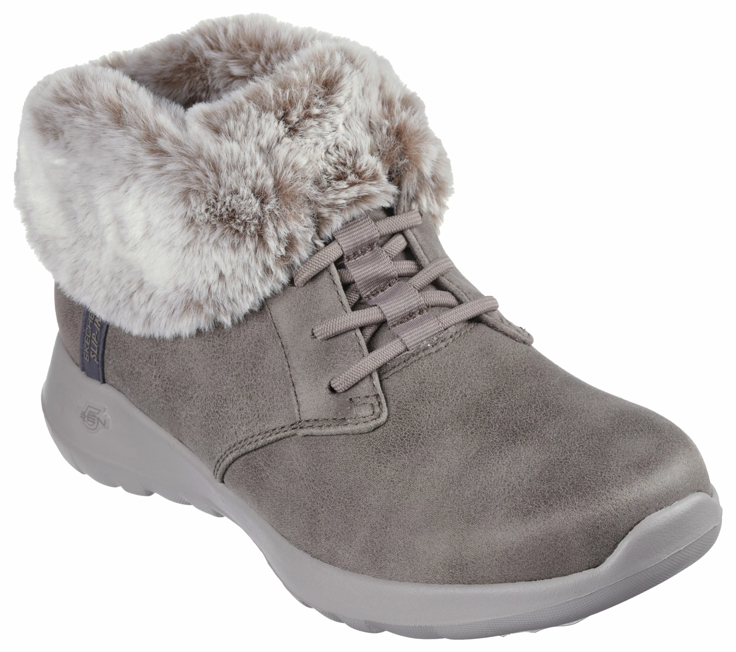 Enjoy the season in plush comfort with Skechers Hands Free Slip-ins®: On-the-GO® Joy – Cozy Charm. Designed with our exclusive Heel Pillow, this bootie features a 3M® Scotchgard® treated vegan leather upper with stretch laces, faux-fur trim, 5-GEN® Technology cushioning, and a Skechers Air-Cooled Memory Foam® insole.