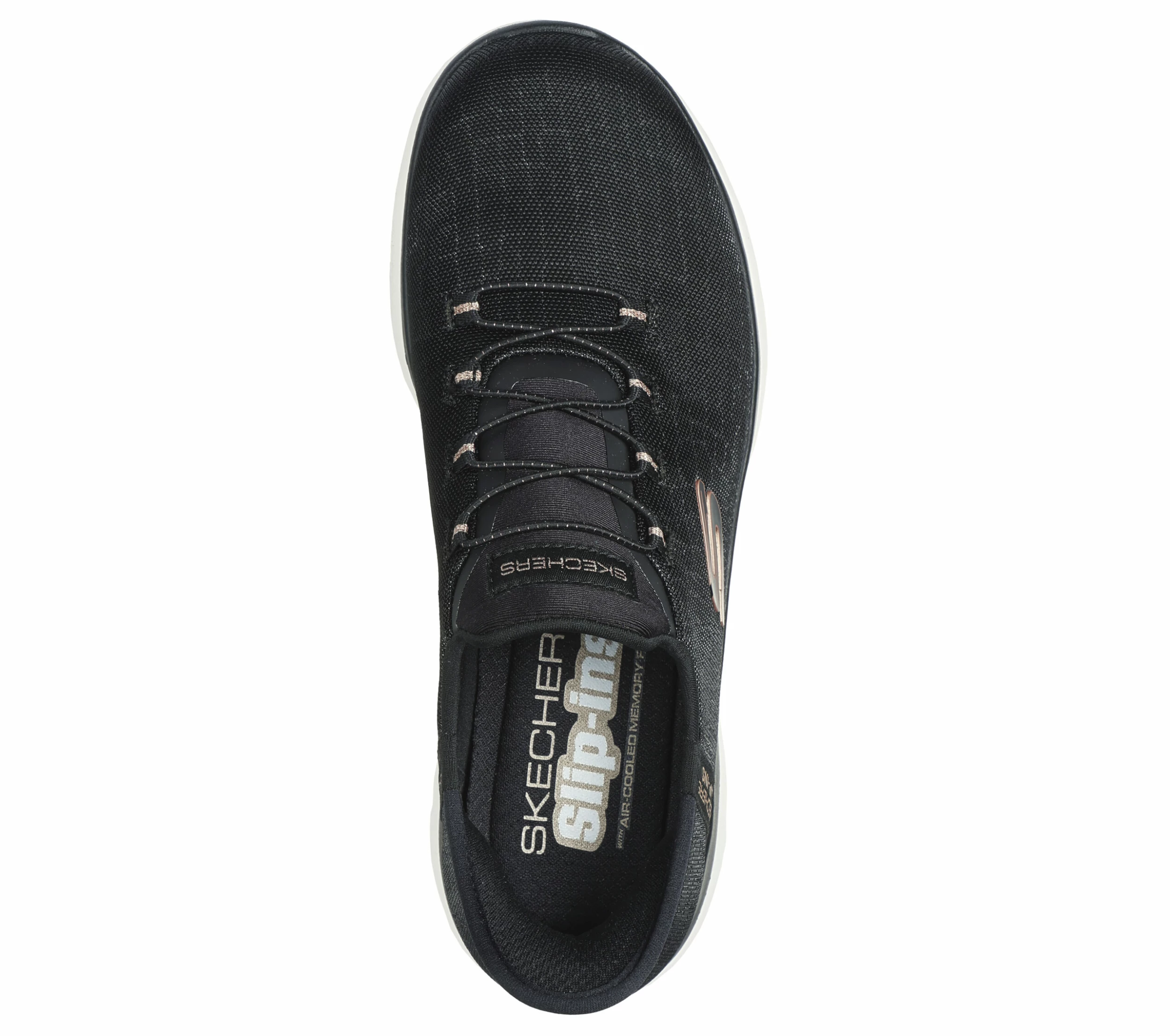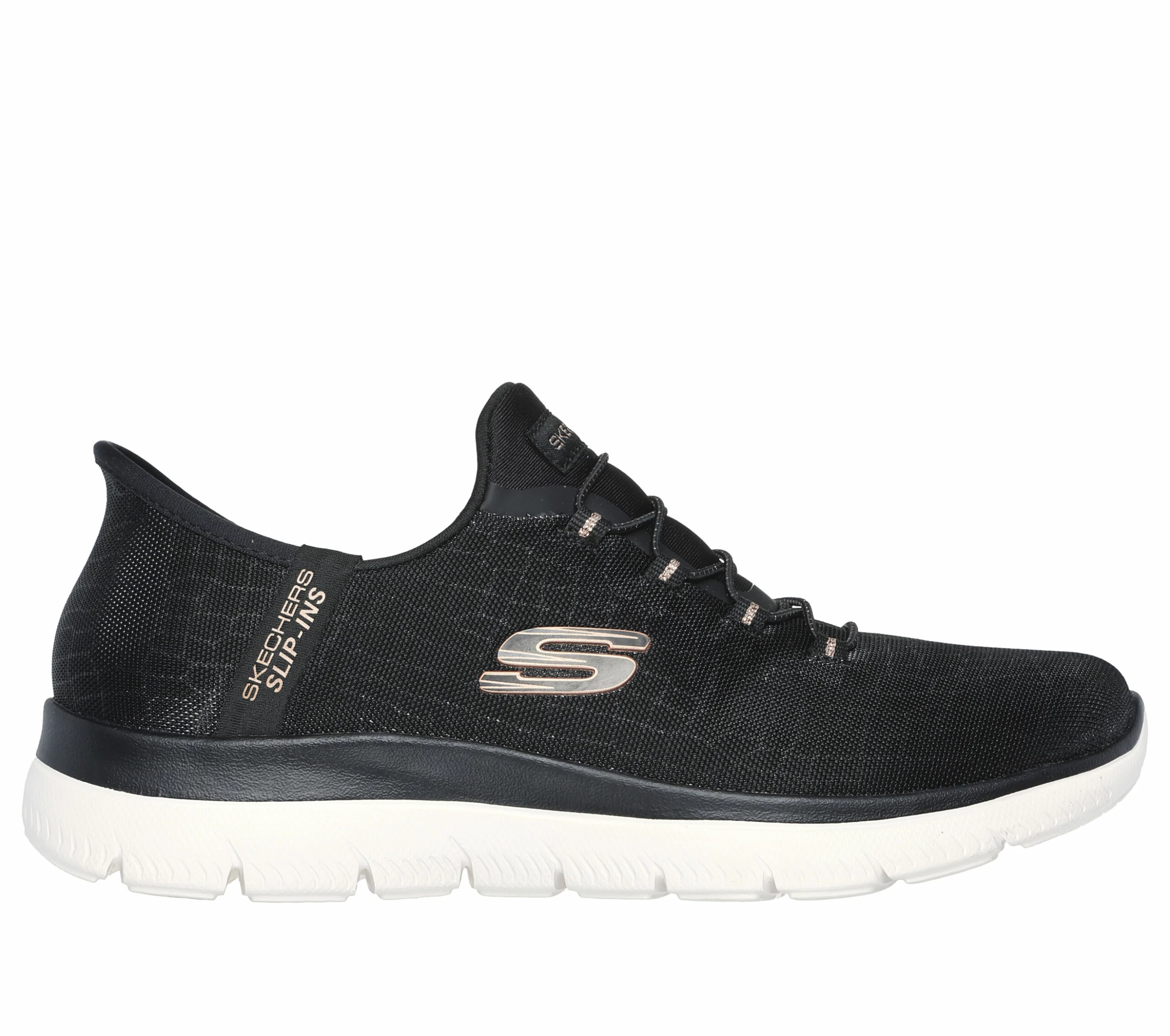 Add a little glam to your step with the effortlessly comfortable Skechers Slip-ins®: Summits – Classy Night. Designed with our exclusive Heel Pillow, this vegan style features a snake patterned sparkle mesh upper with fixed stretch laces and a cushioned Skechers Air-Cooled Memory Foam® comfort insole.