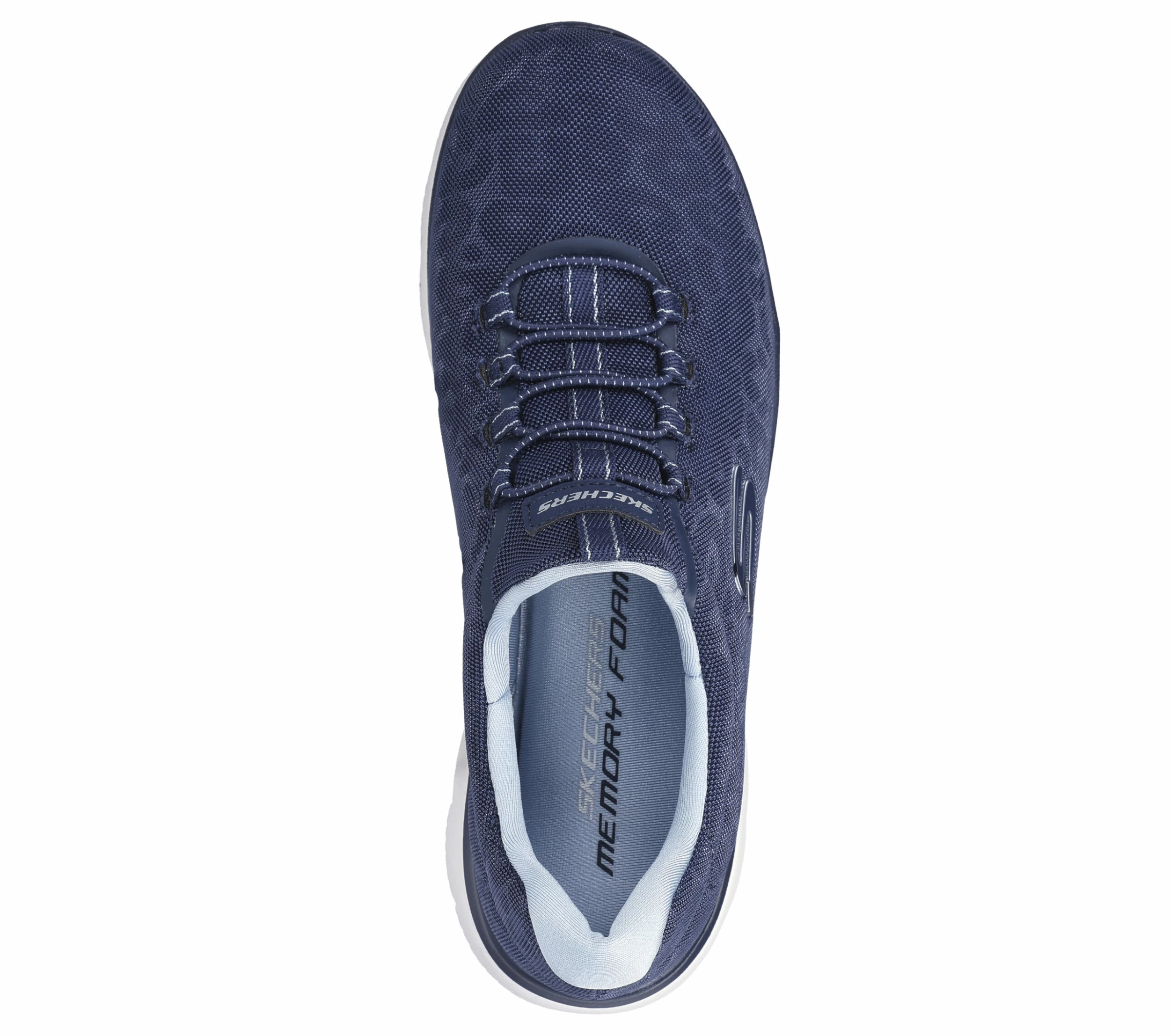 Reach the height of comfort and athletic style with Skechers Summits – Sparkling Spots. This fun vegan design features a sparkly leopard mesh upper with fixed stretch laces and a cushioned Skechers Memory Foam™ cushioned comfort insole.