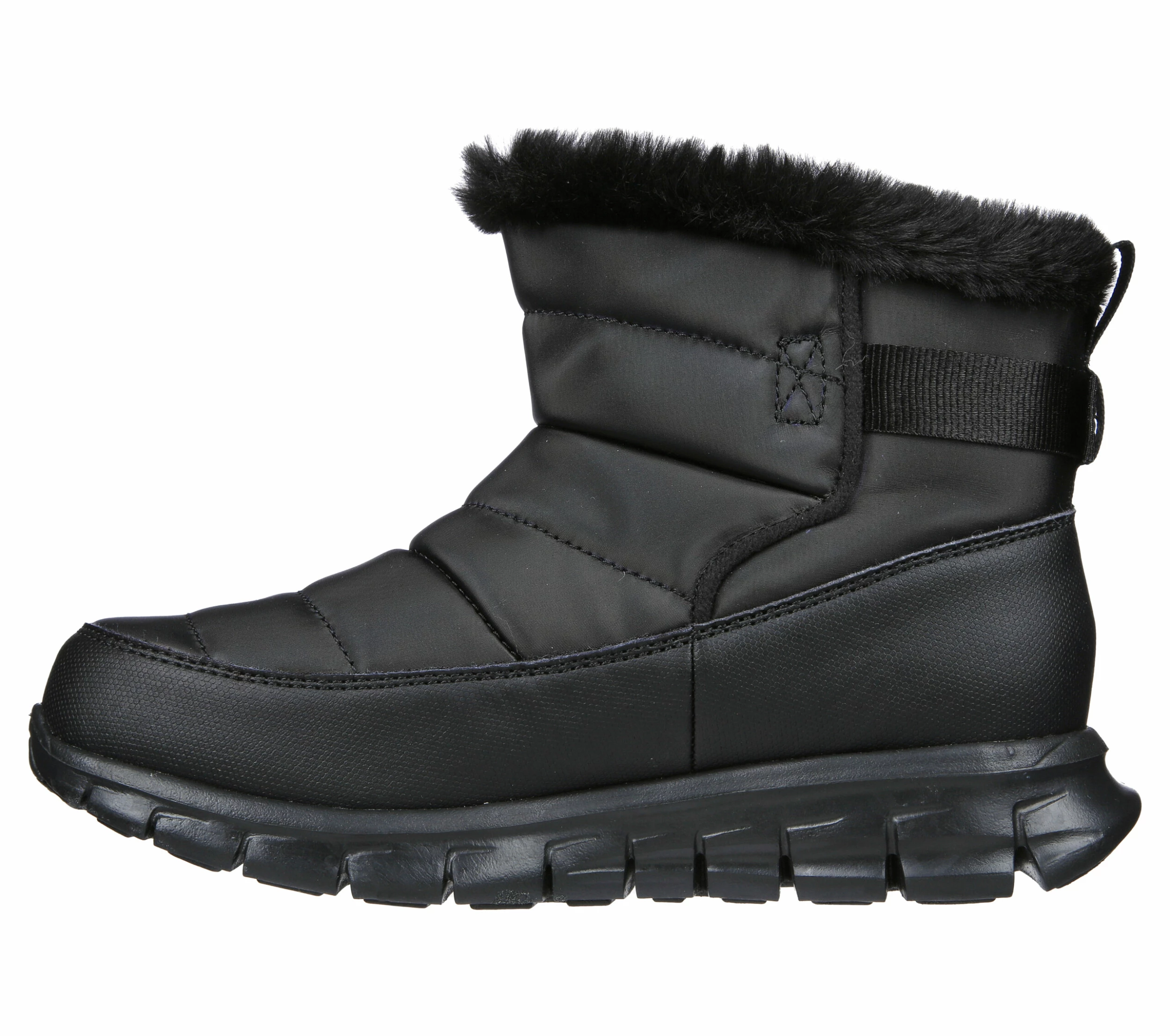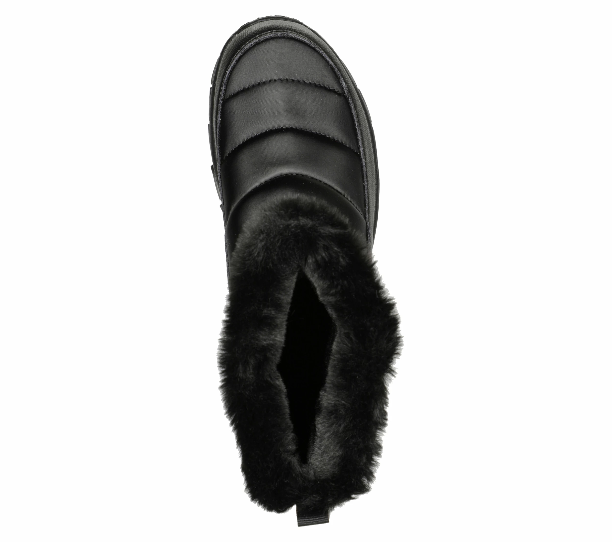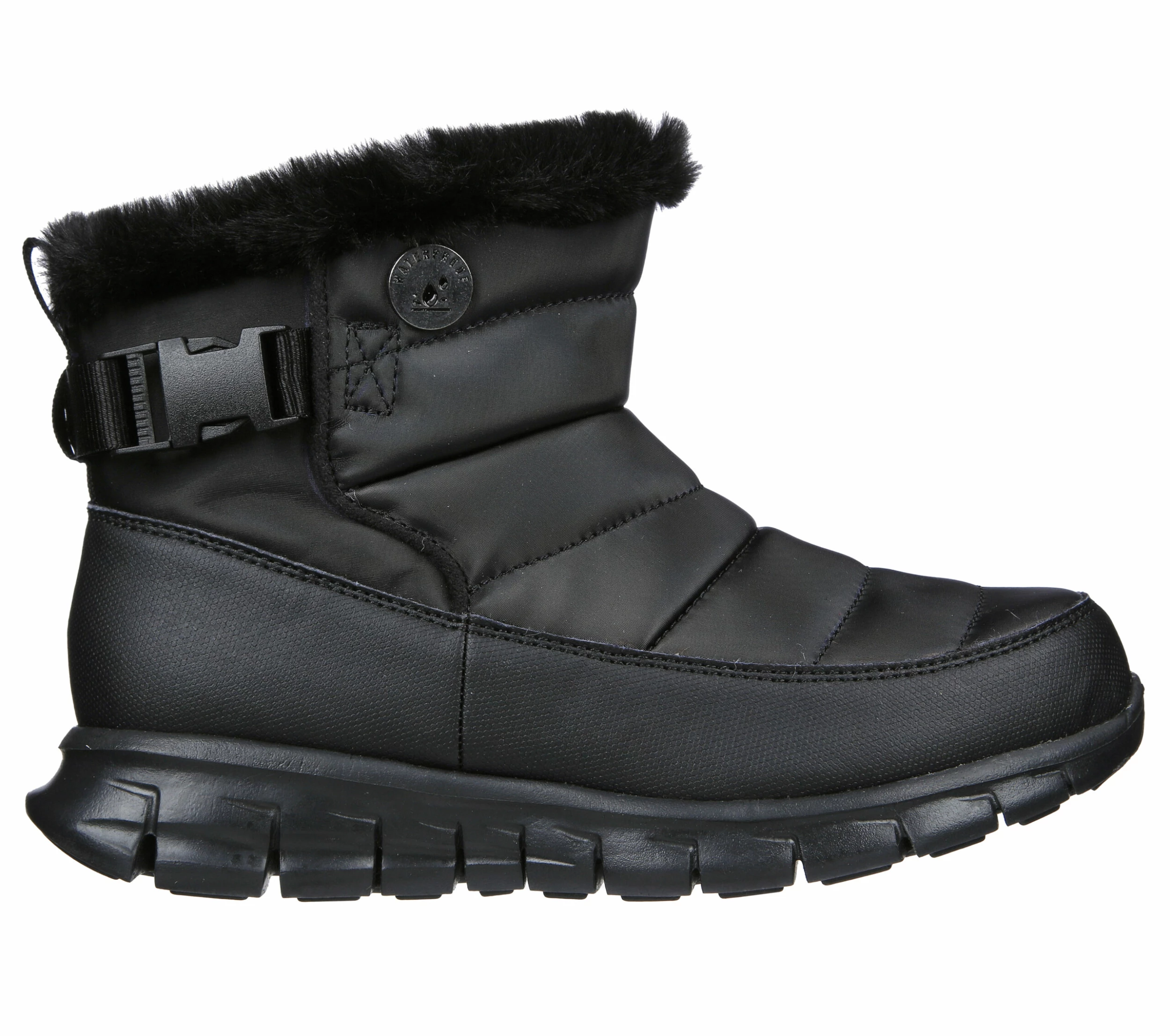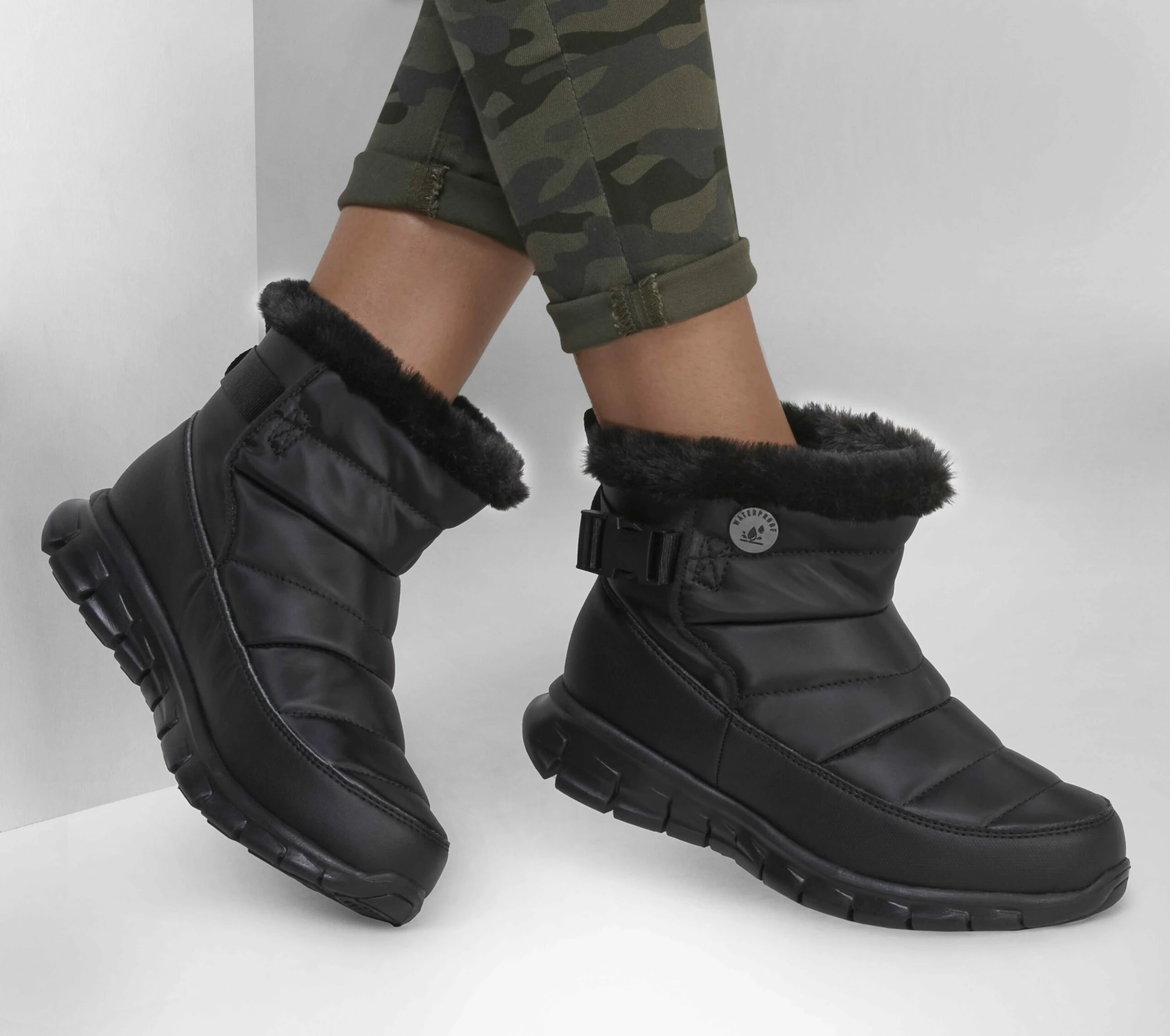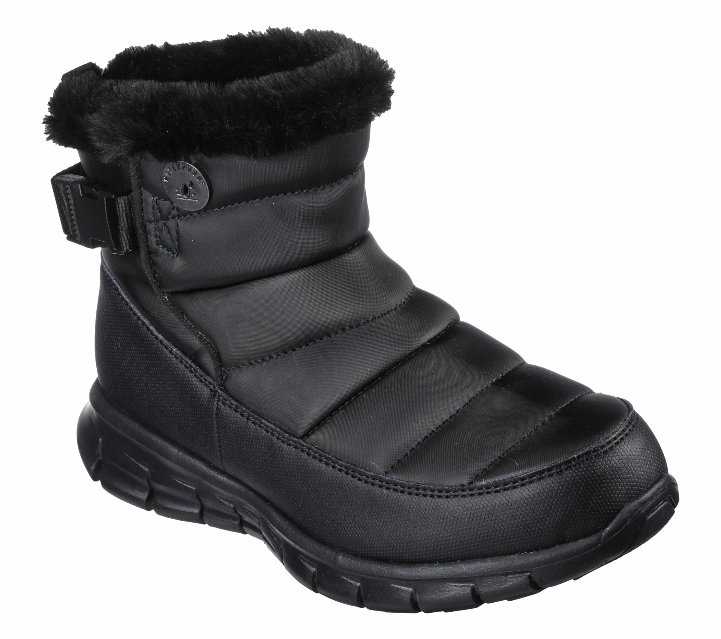 Stay warm and cozy this season with Skechers Synergy – Nocturne. This waterproof puffer style bootie features a slip-on synthetic duraleather upper with a faux-fur trim, strap buckle closure, cushioned Skechers Warm Tech Memory Foam insole and an anti-slip outsole.