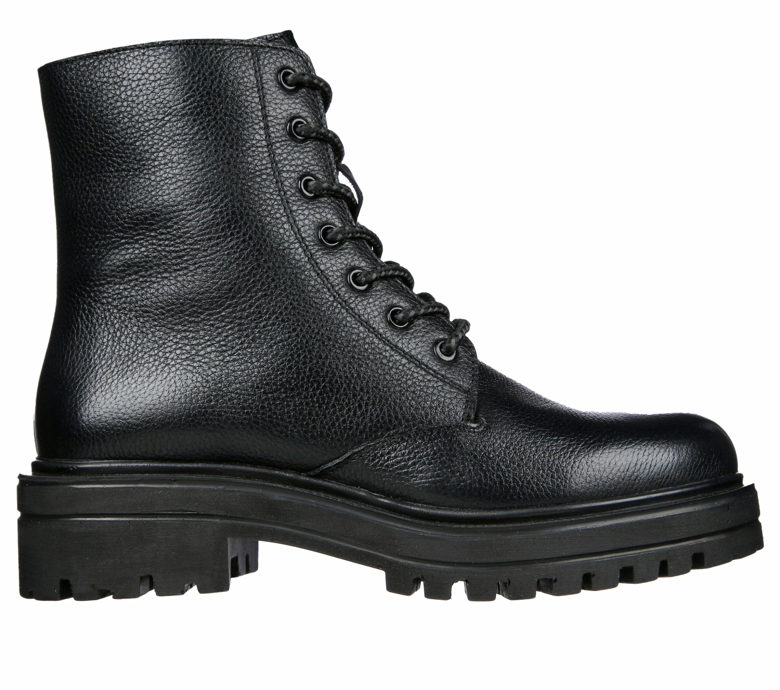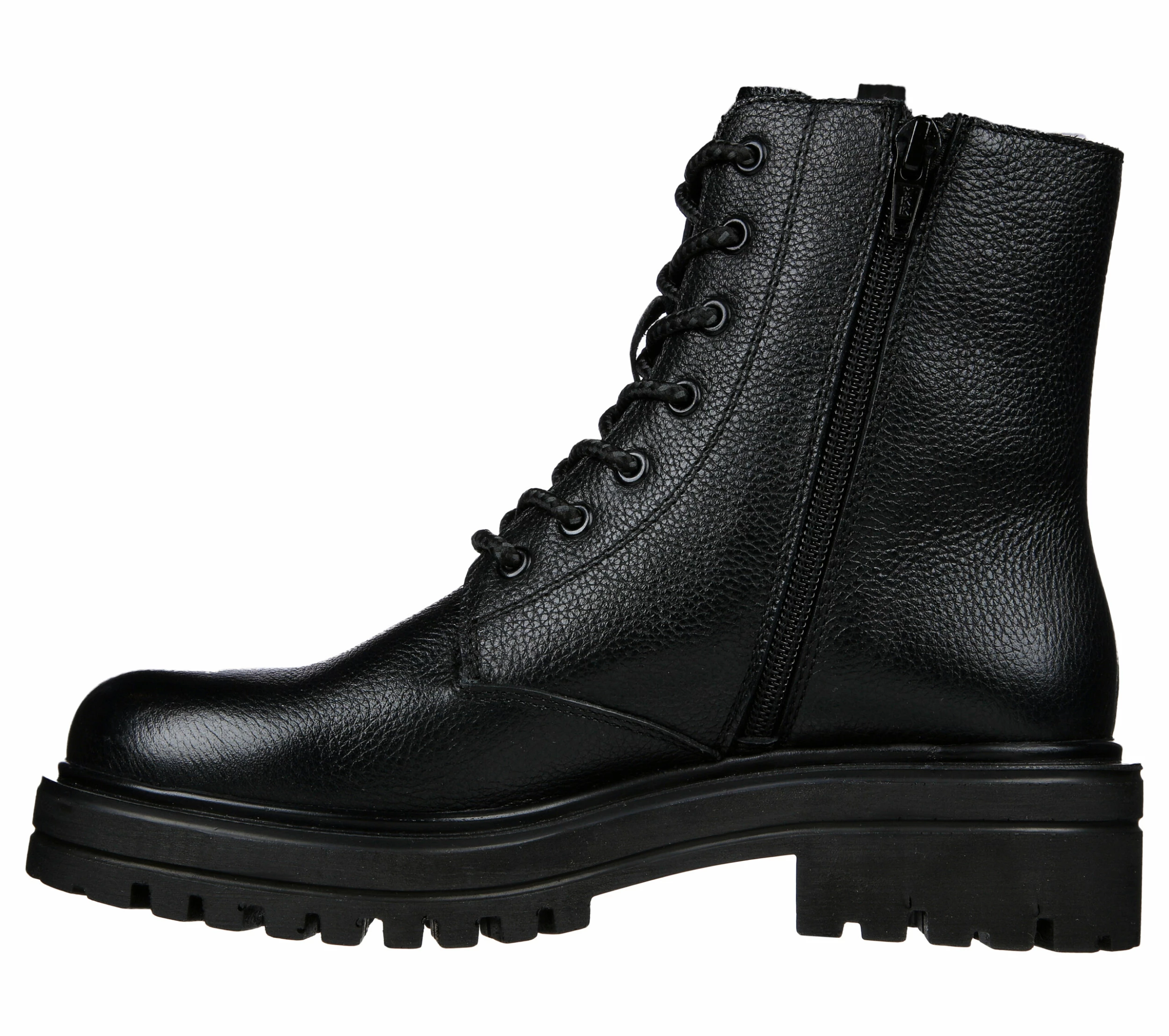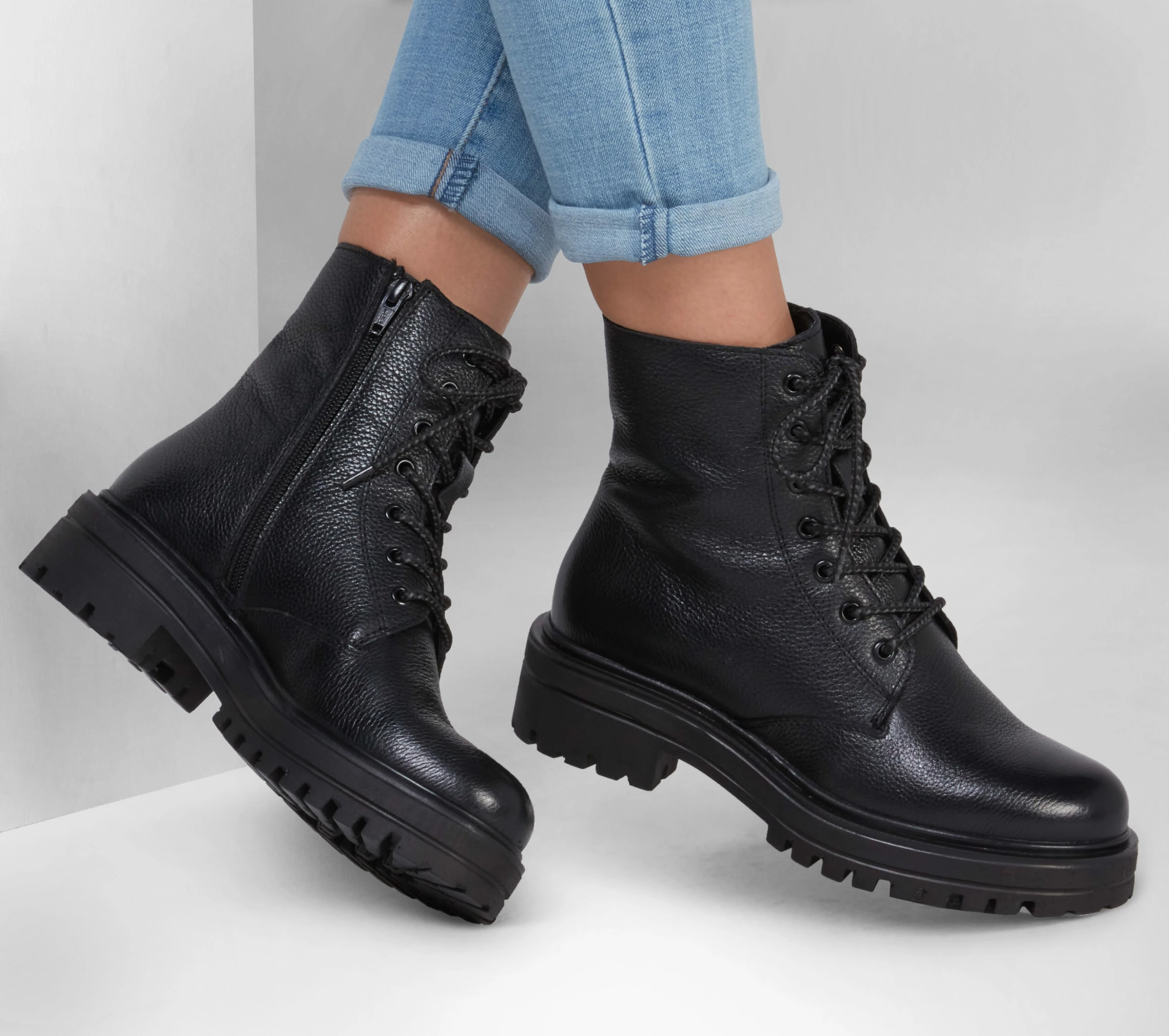 Kick into gear wearing Skechers Teen Rider. This classic combat fashion boot features a seven-eye lace-up front with a side zip closure, genuine leather upper, an articulated lug traction outsole, and a Skechers Memory Foam™ cushioned comfort insole.