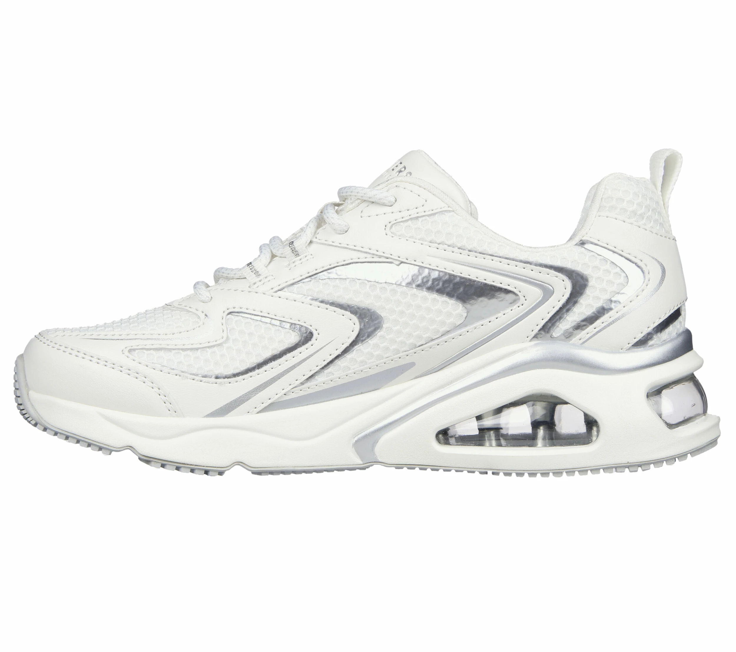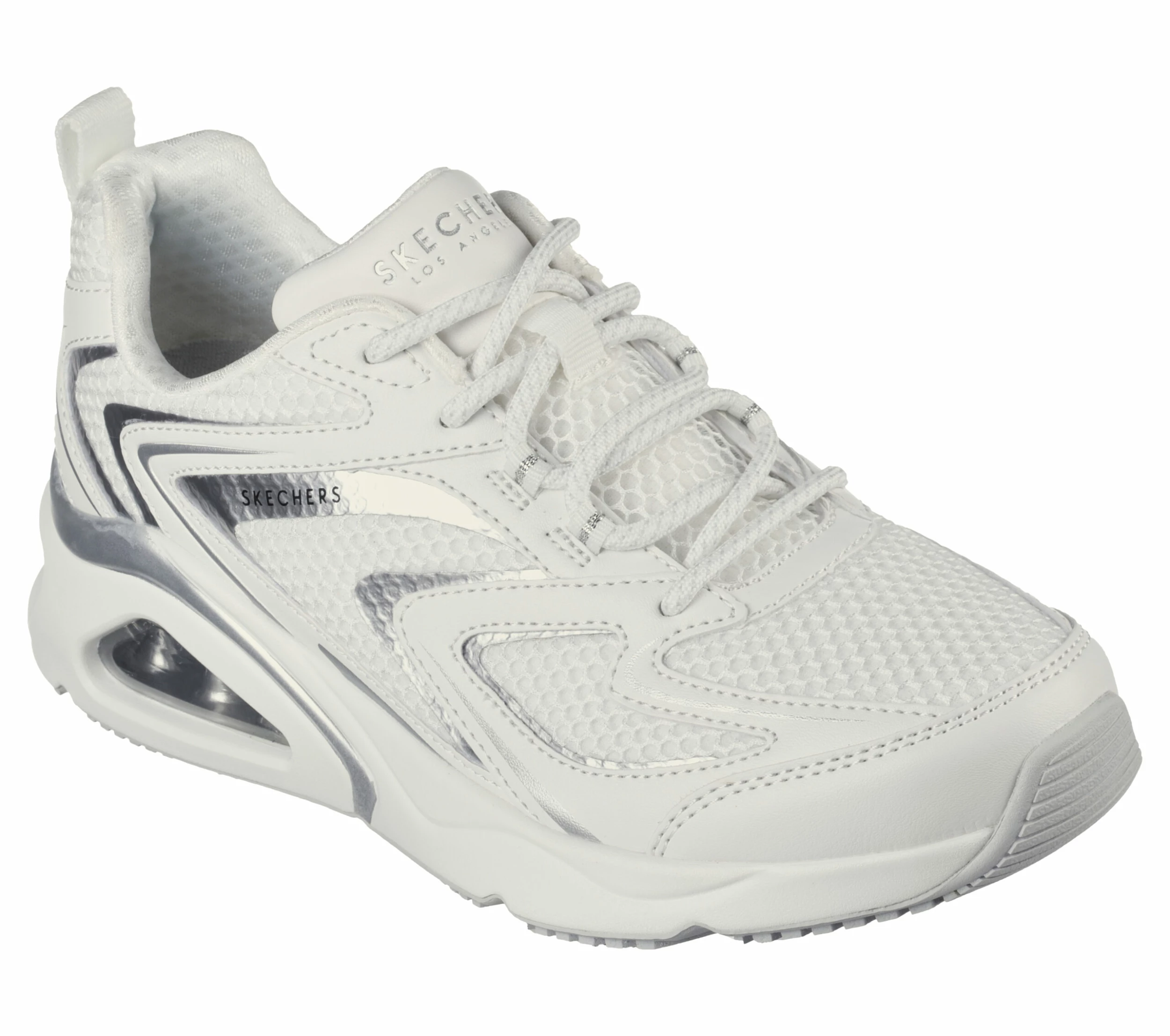 Show out in subtle flashes of metallic fashion and comfort wearing Skechers Street Tres-Air Uno – Vision-Airy. This sporty fashion lace-up features a mesh and duraleather upper with metallic hotmelt overlays, a visible Skech-Air® airbag midsole and a Skechers Air-Cooled Memory Foam® insole.