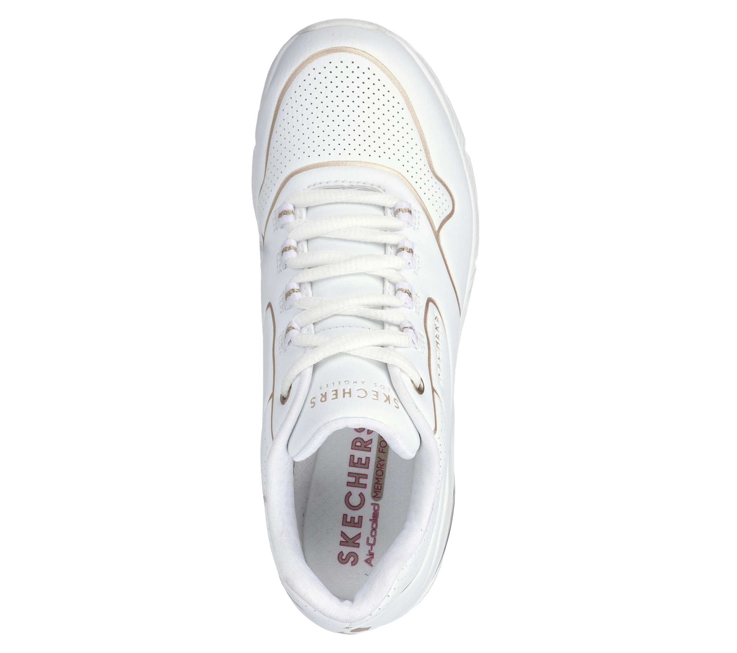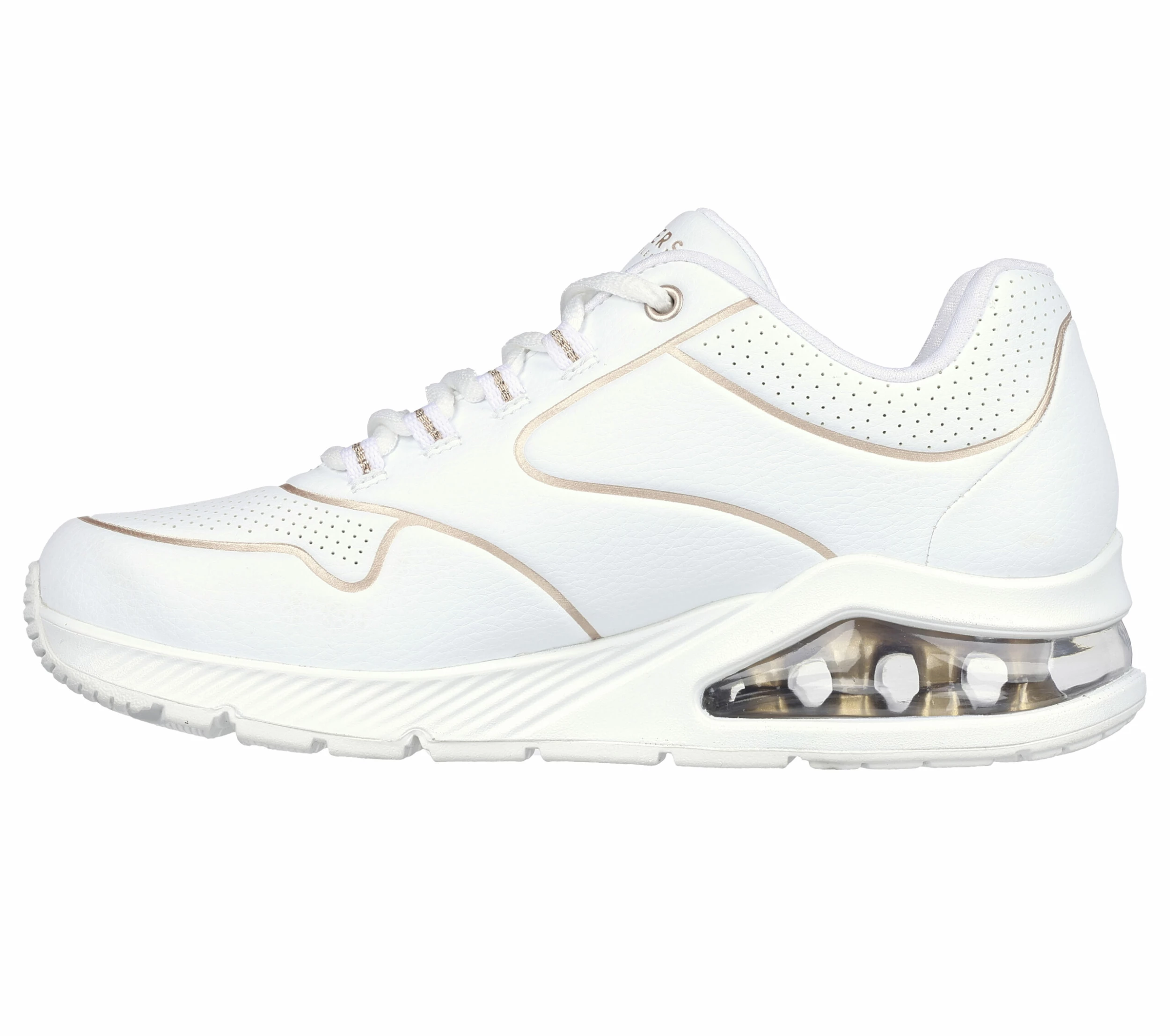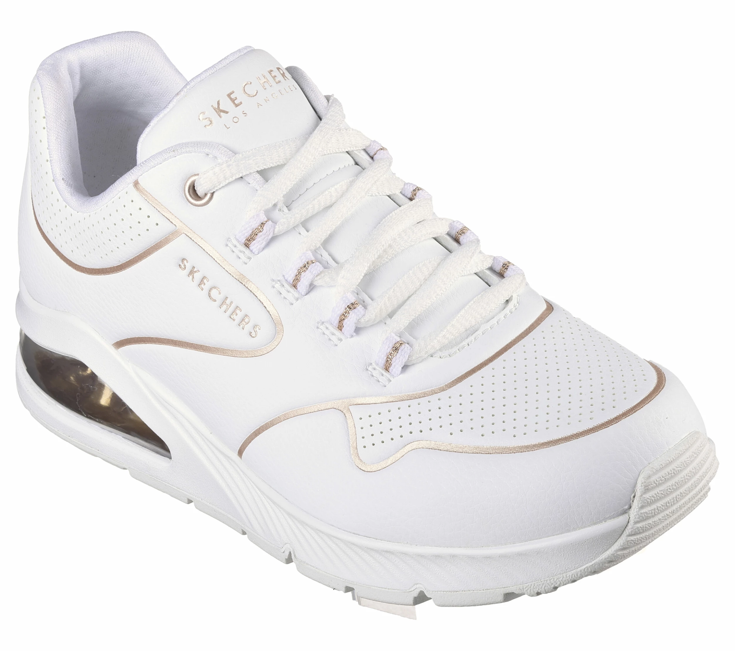 Stand out with a luxe statement in Skechers StreetĀ Uno 2 – Golden Trim. This fashion lace-up features a synthetic durabuck upper with gold trim detailing, Skechers Air-Cooled Memory FoamĀ® insole and a visible Skech-AirĀ® airbag midsole.