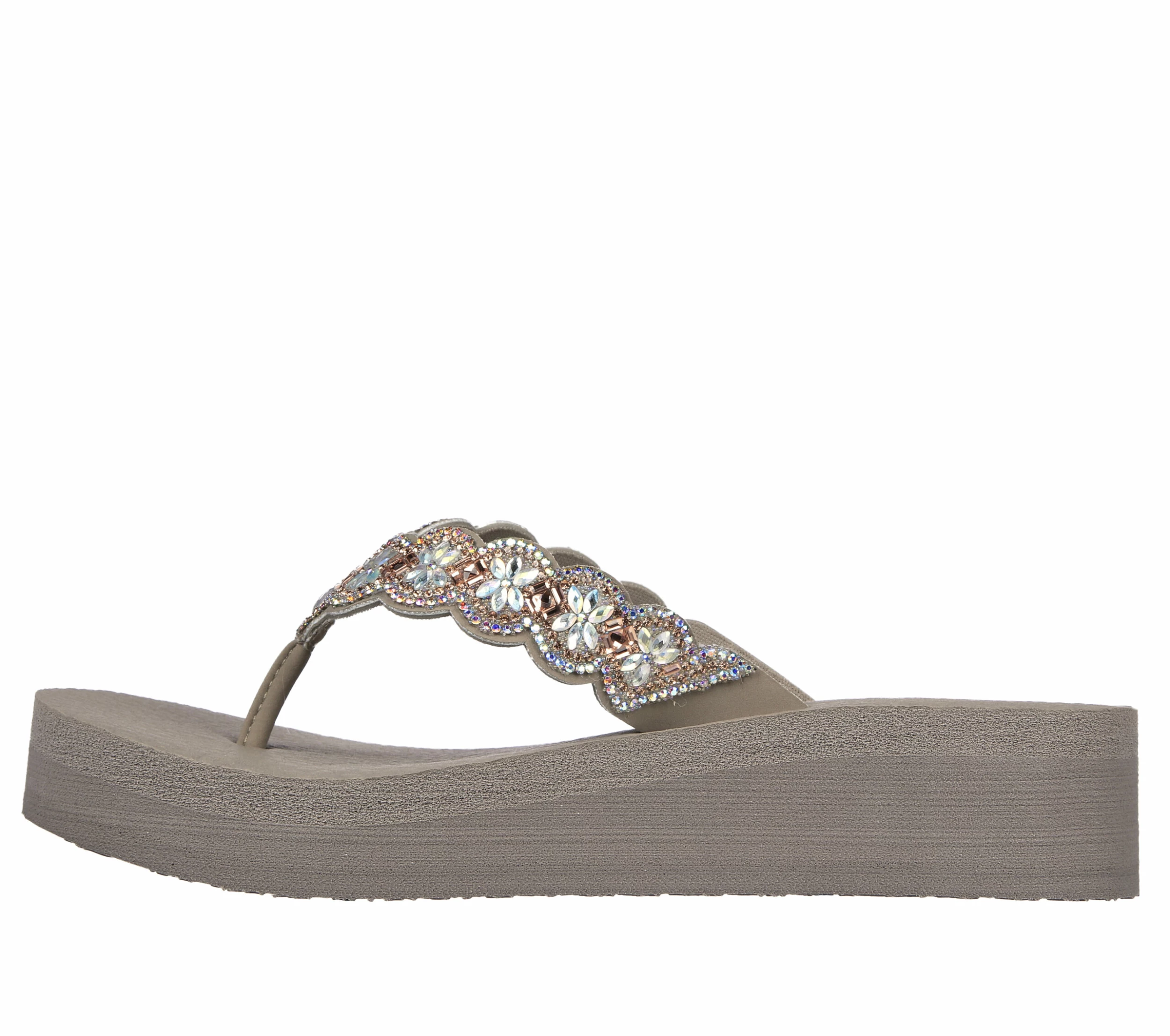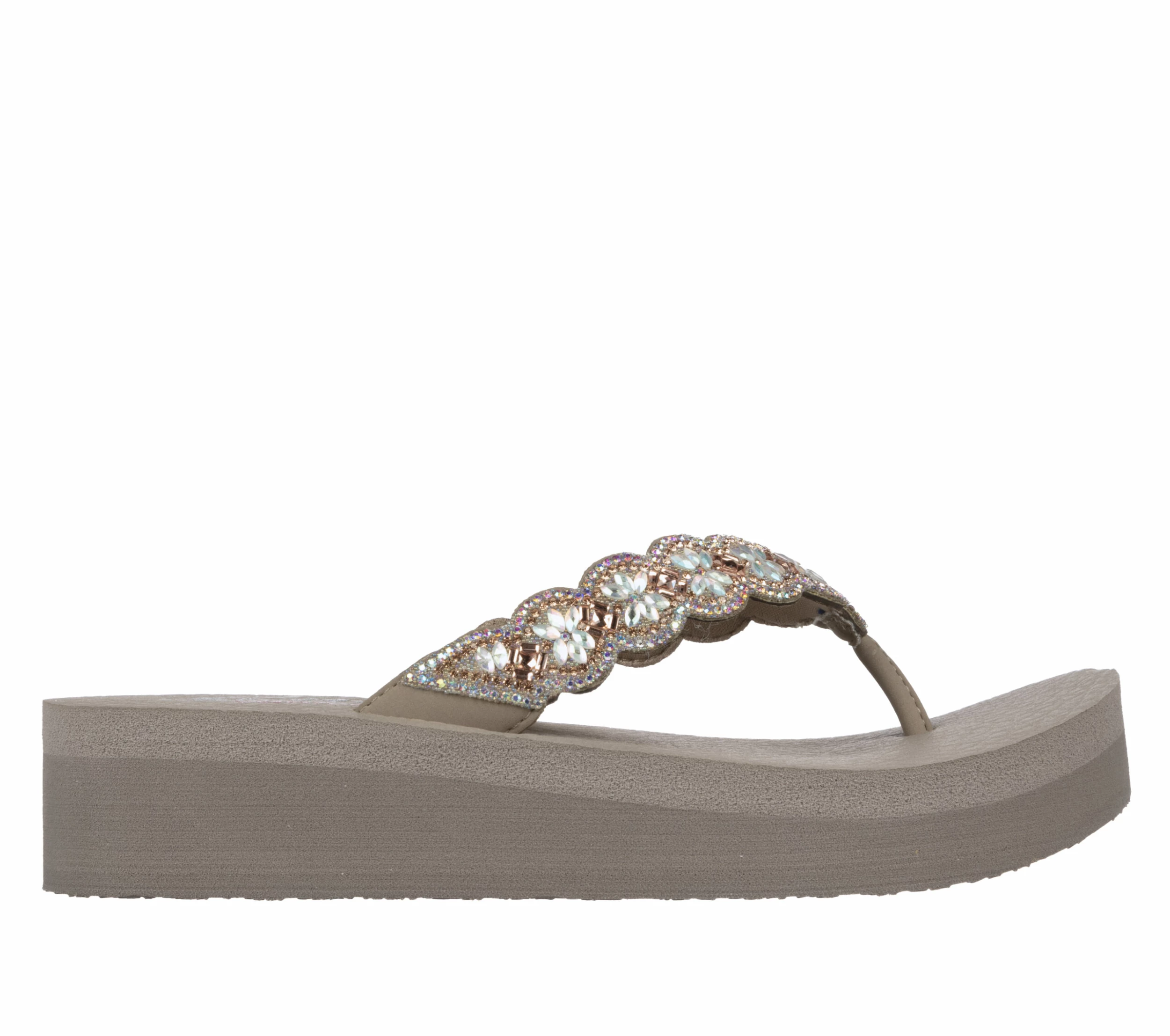 Dazzle your steps in floral style and comfort with Skechers CaliĀ® Vinyasa – Happy Spring. This wedge thong sandal features a scalloped synthetic upper with flower patterned rhinestone details and a cushioned Yoga FoamĀ® comfort footbed.