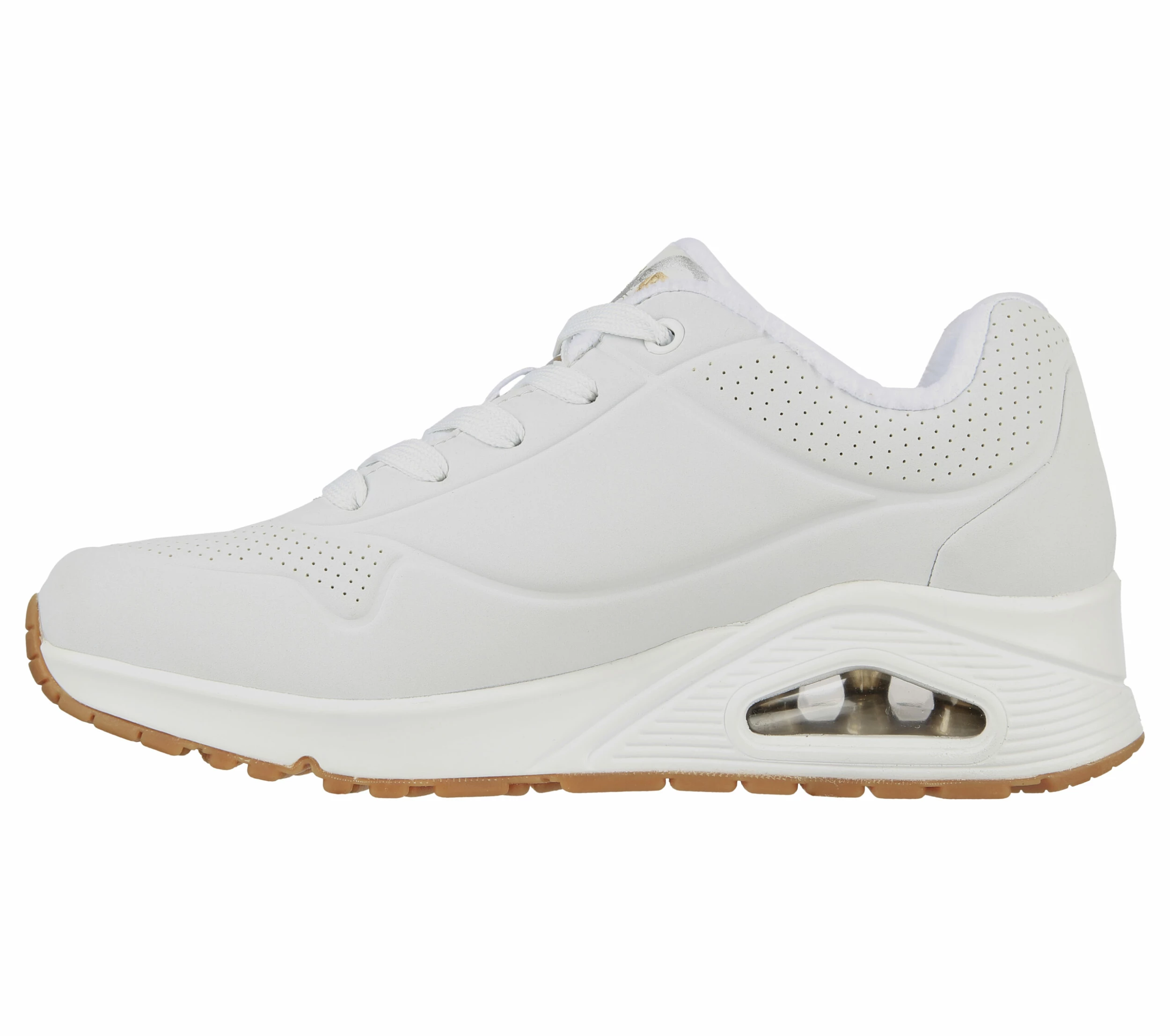 Internationally renowned muralist James Goldcrown brings his iconic #Lovewall heart designs to Skechers in this inspiring collaboration. Show off your creative style in Skechers x JGoldcrown: Uno – Metallic Love. This fashion lace-up features a metallic print of the artist’s signature heart design on a synthetic duraleather upper with a Skechers Air-Cooled Memory Foam® insole and a platform wedge with visible Skech-Air® air-cushioned midsole.